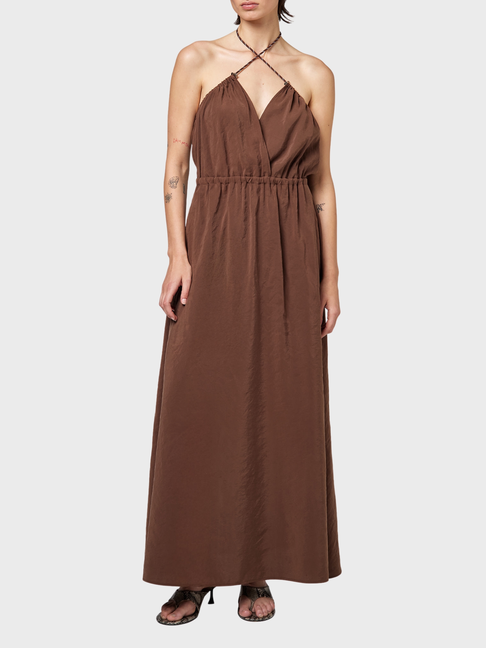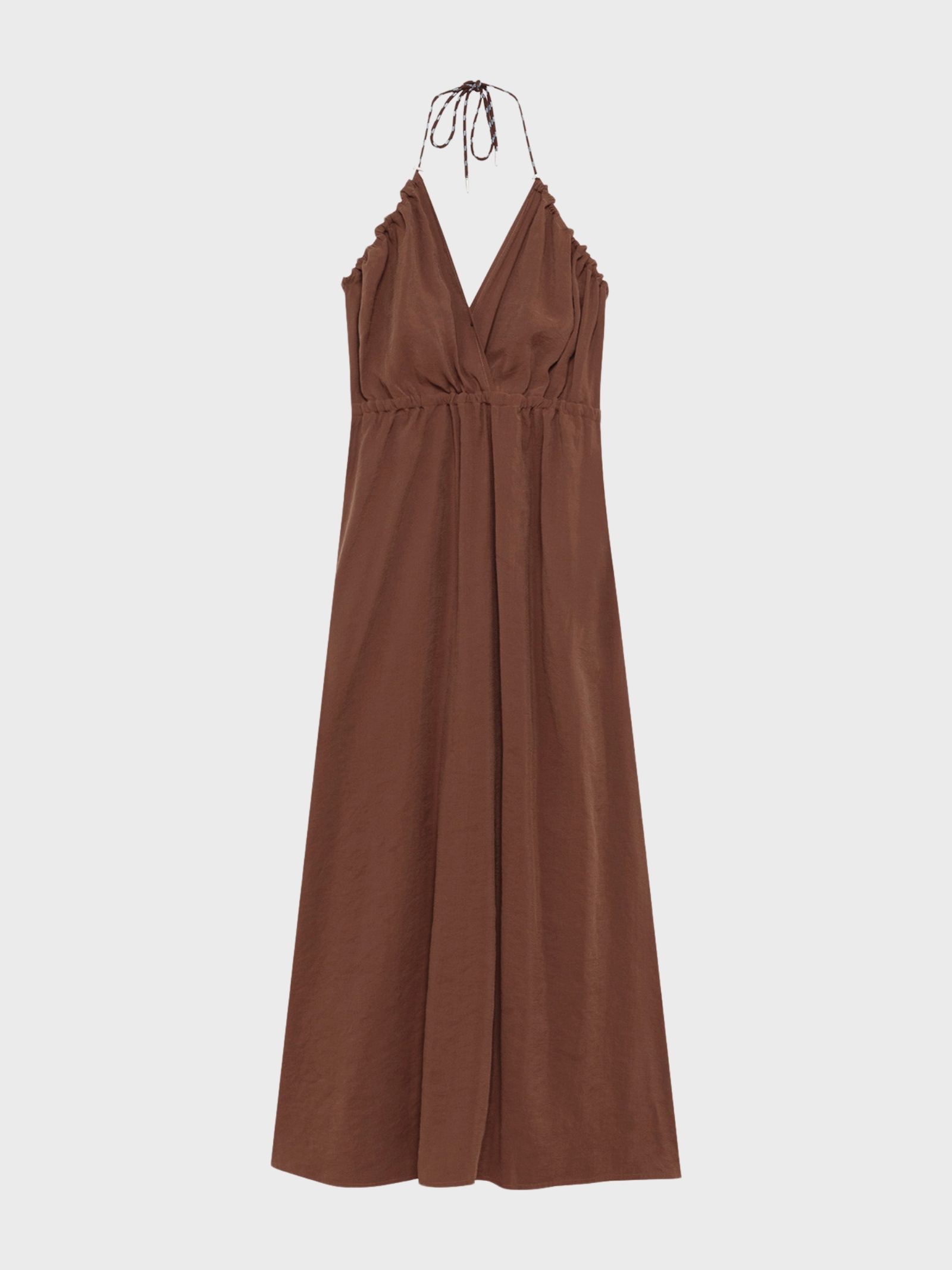 Long dress with a fluid and feminine design. Crossed halter neckline with a technical tie closure at the back. Elasticated gathered waist enhances the silhouette while ensuring comfort. Regular fit.