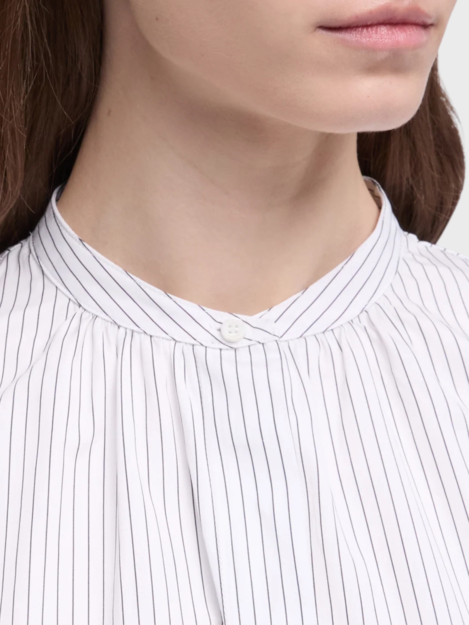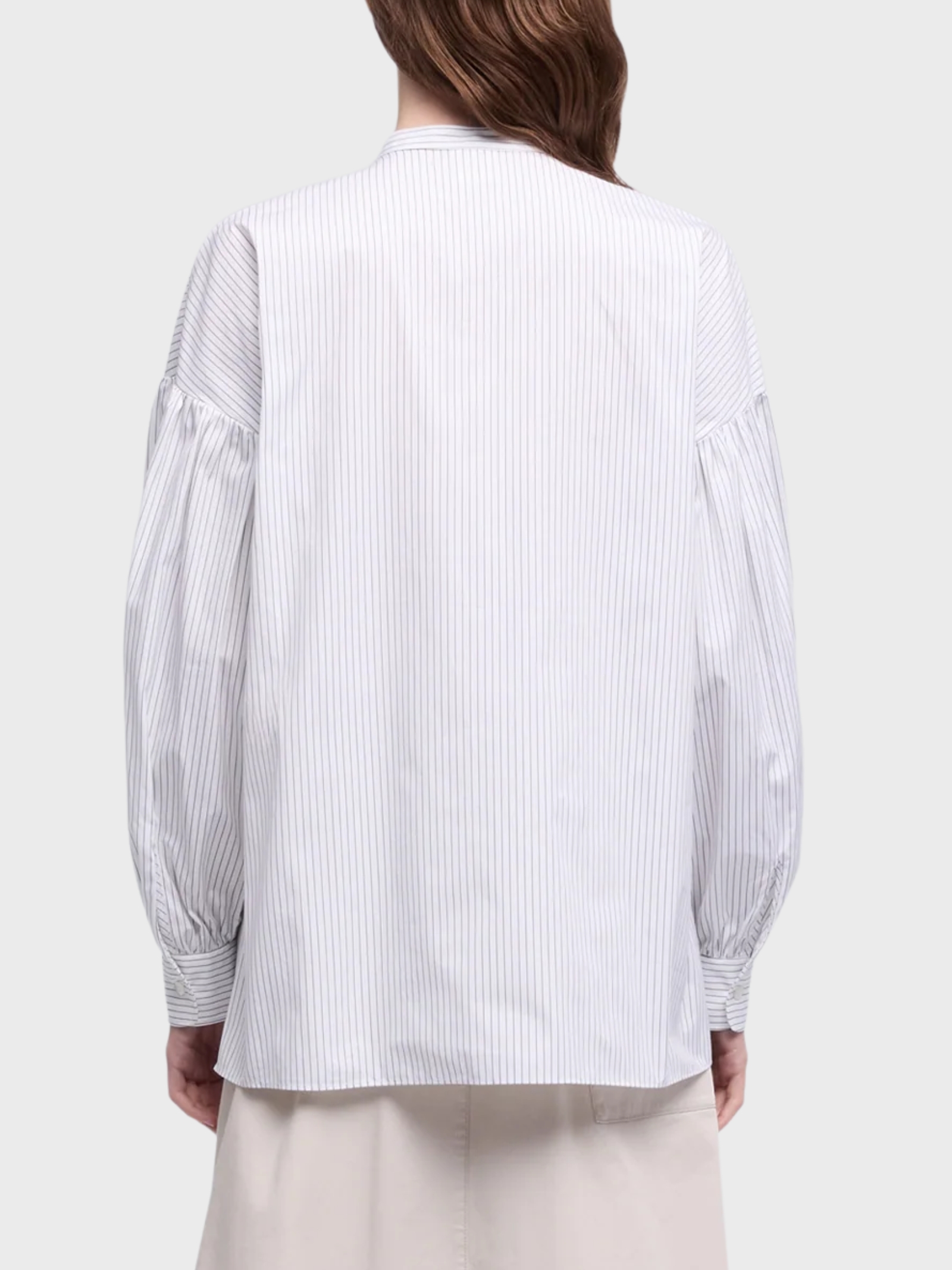 Shirt in 120/2 striped cotton poplin with a refined and contemporary design. Gathered band collar and hidden button closure for a clean look. Long gathered sleeves with slit and cuffs. Soft and fluid silhouette. Part of the Capsule Alberto Aspesi collection. Loose fit.