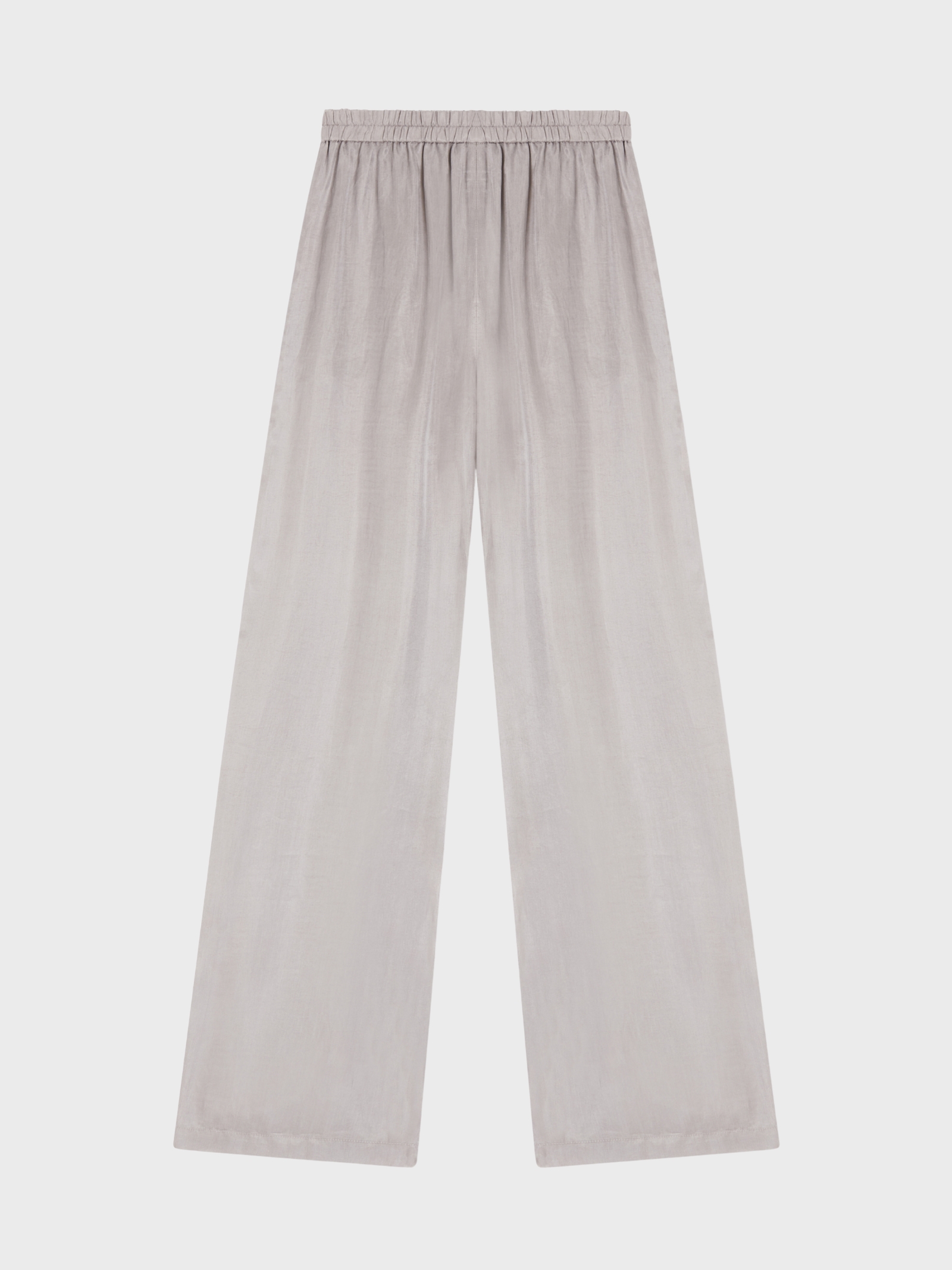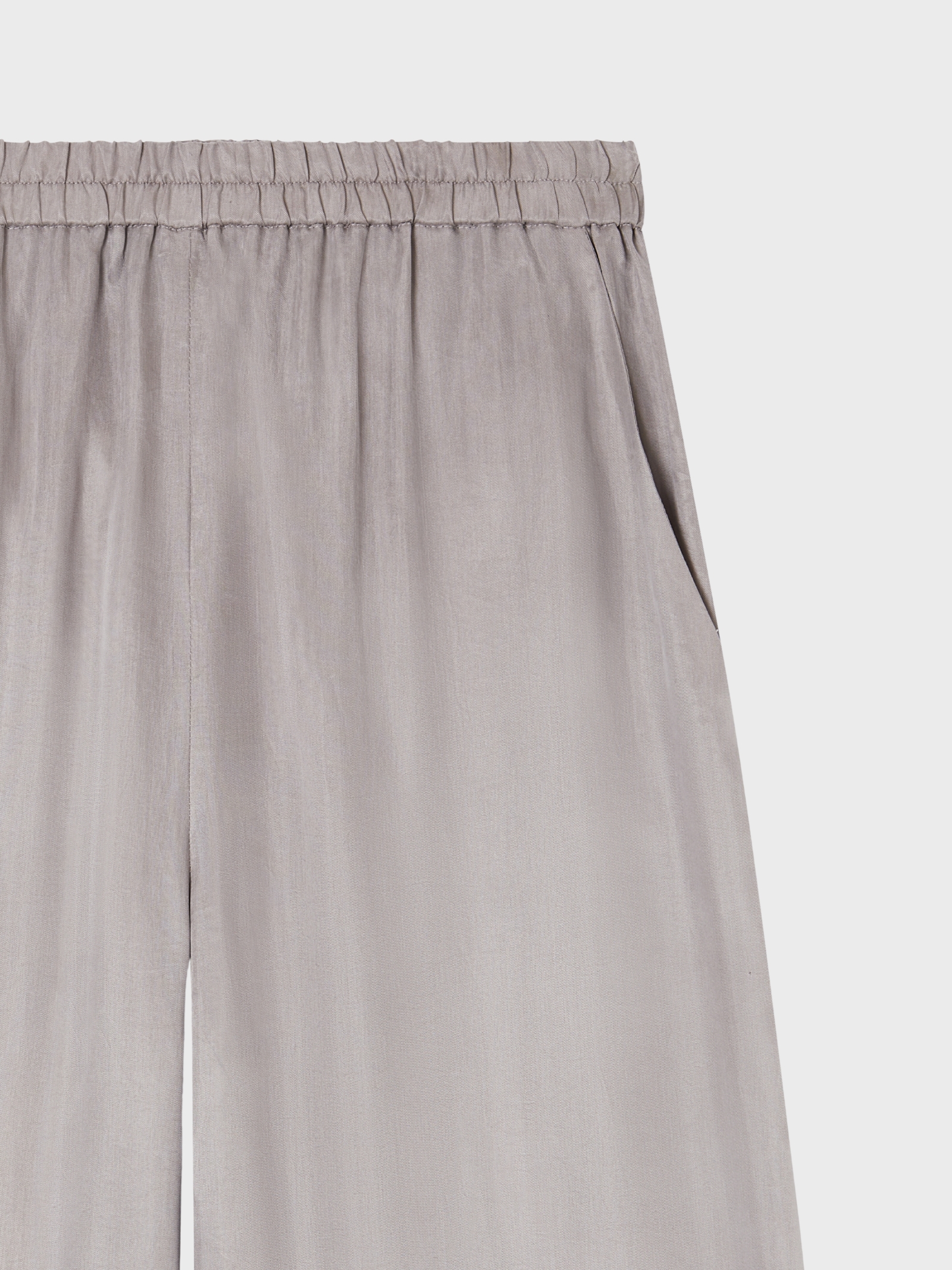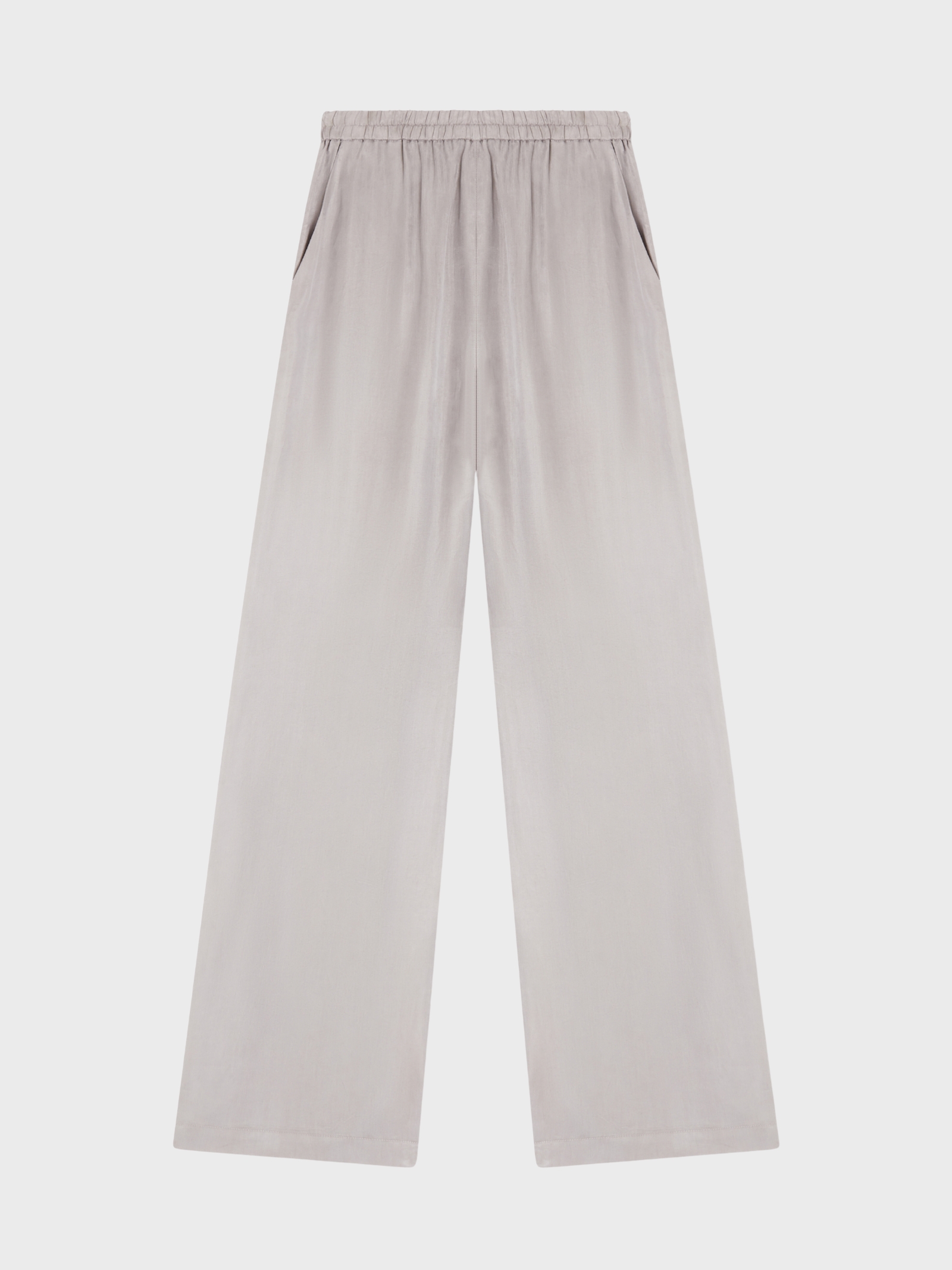 Trousers in washed fluid lyocell, featuring a soft texture and elegant drape. The slightly glossy, shifting finish creates a fluid, almost liquid effect, adding a modern and refined touch. The elastic waistband ensures comfort and ease of wear, perfect for relaxed yet polished looks.