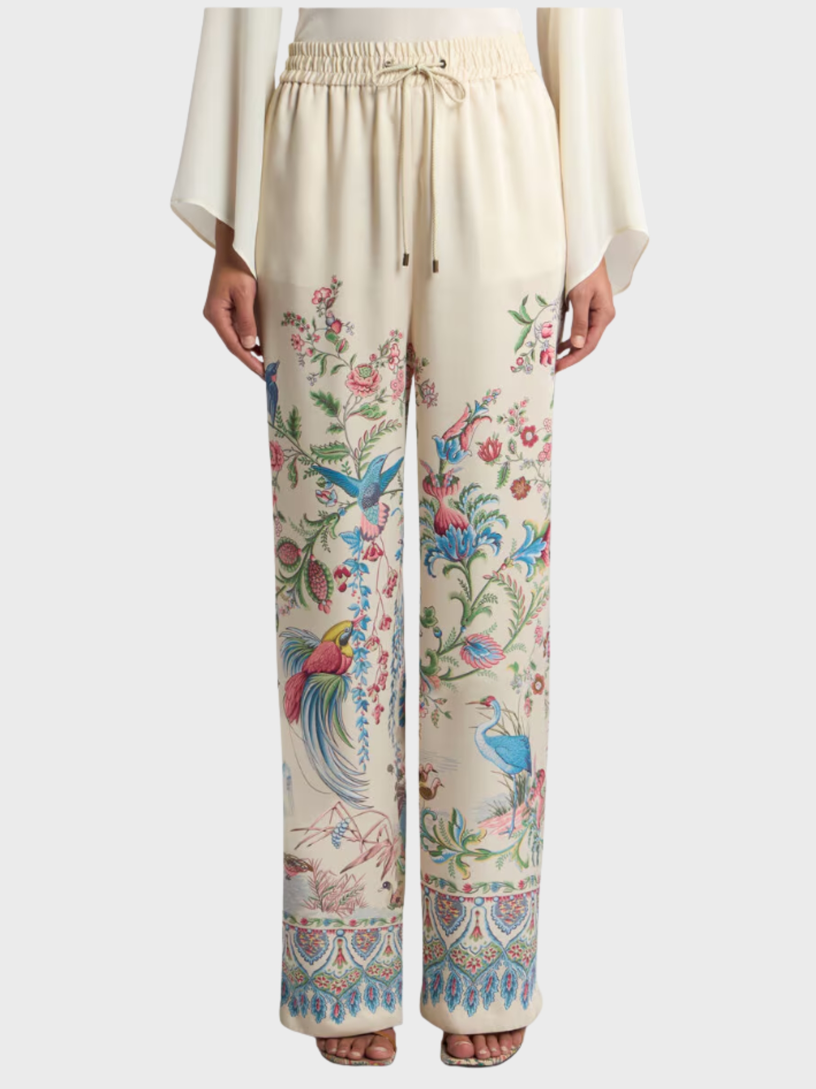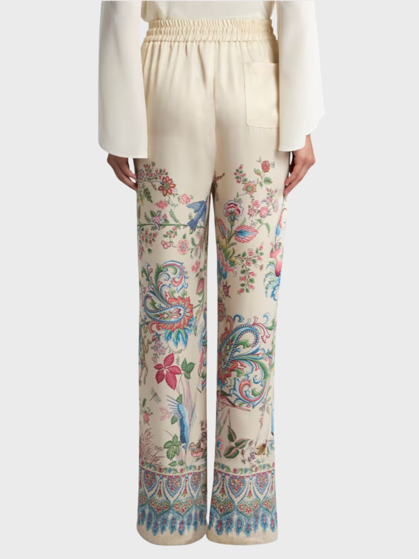 Trousers crafted from white fluid twill, featuring a refined multicolour floral print. The design is defined by a wide-leg silhouette and a high elasticated waist with drawstring, ensuring comfort and a regular fit. The style is completed by two side pockets and a rear patch pocket, balancing elegance and functionality.