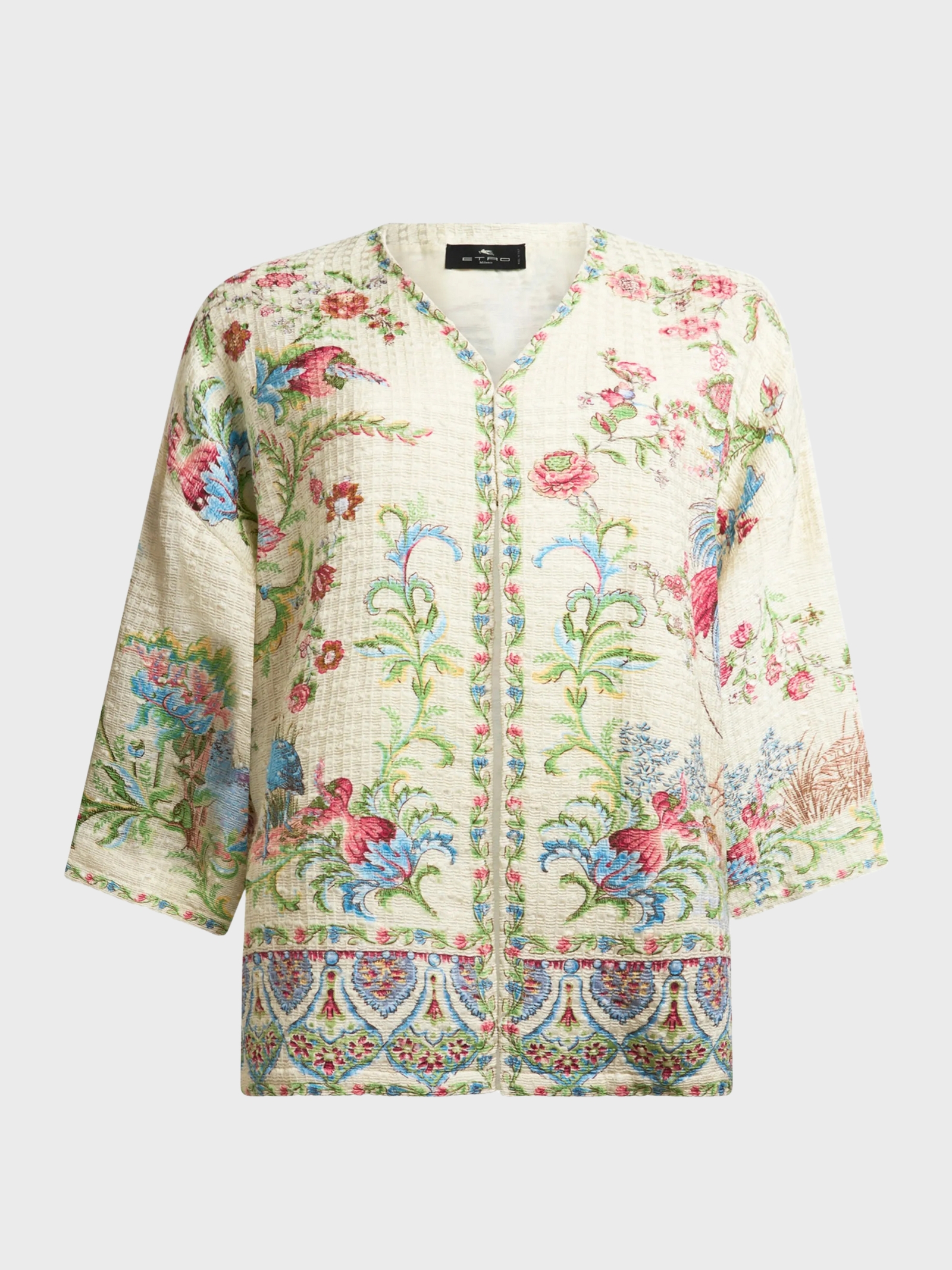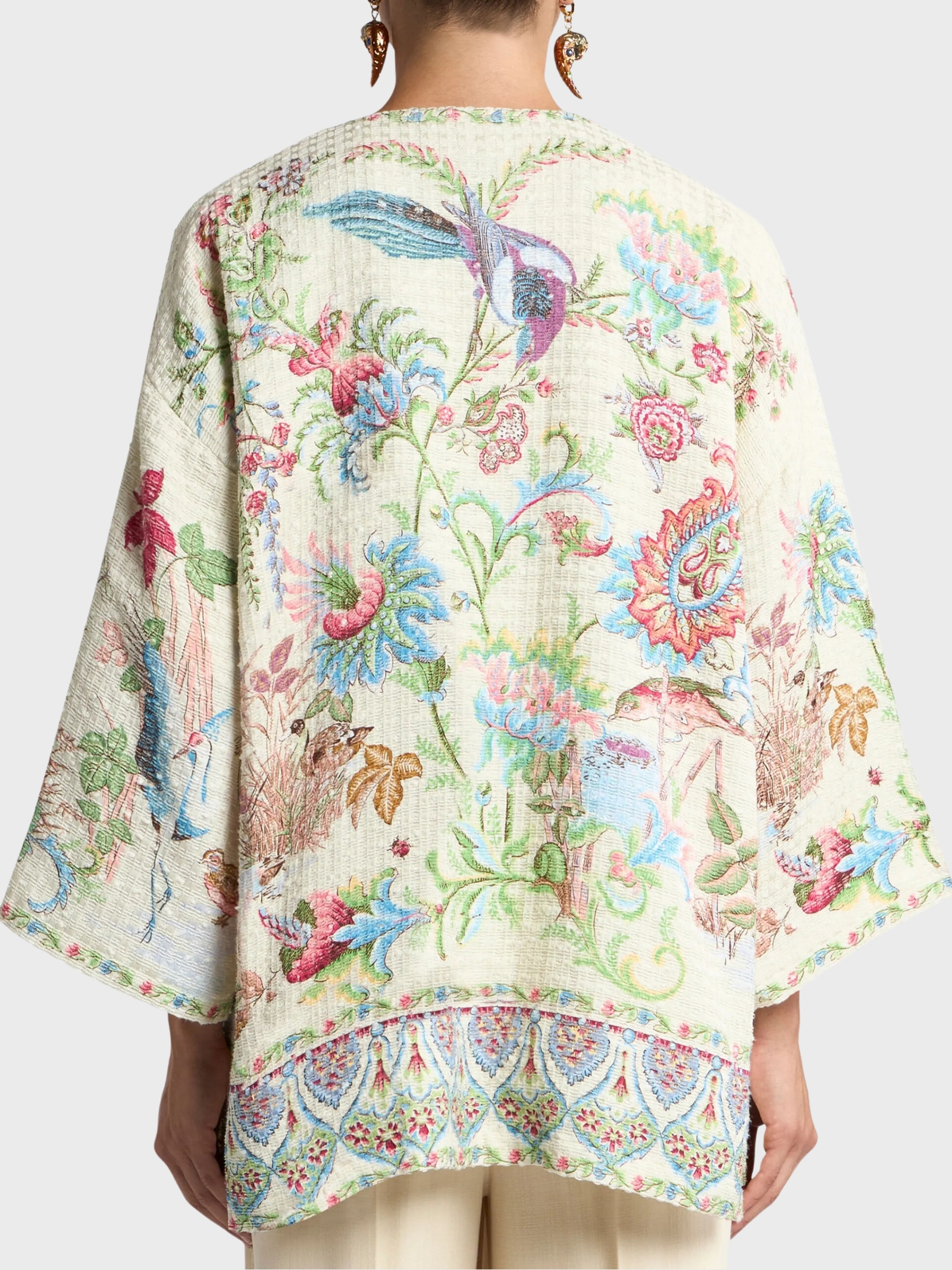 Kesa crafted from straw-like mixed cotton fabric, featuring an elegant and versatile silhouette. The model is decorated with a nature-inspired floral and fauna motif and a floral medallion pattern at the hem, adding a distinctive and refined touch. Wide kimono sleeves complete the design, giving the garment lightness and fluidity.