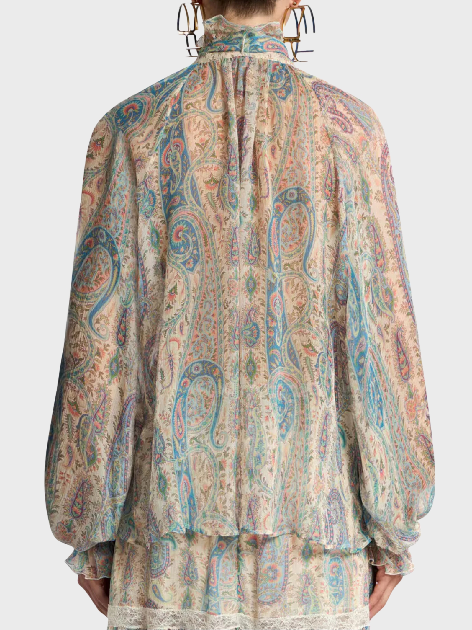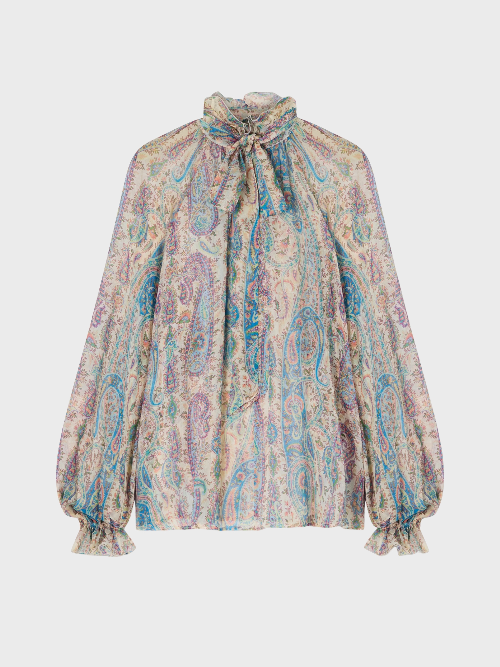 Blouse crafted from lightweight pure silk crêpe, featuring the iconic Paisley motif enriched with foliage-inspired elements. The design is elegant and feminine, with long balloon sleeves and a soft integrated scarf that enhances the high neckline. Tone-on-tone ruffle details at the collar and cuffs complete the look with a refined touch.