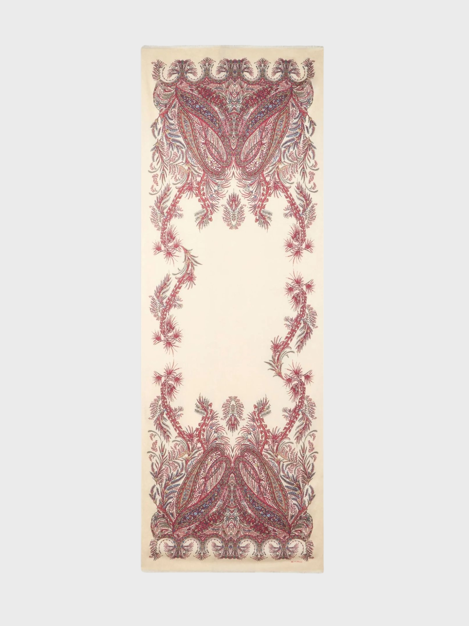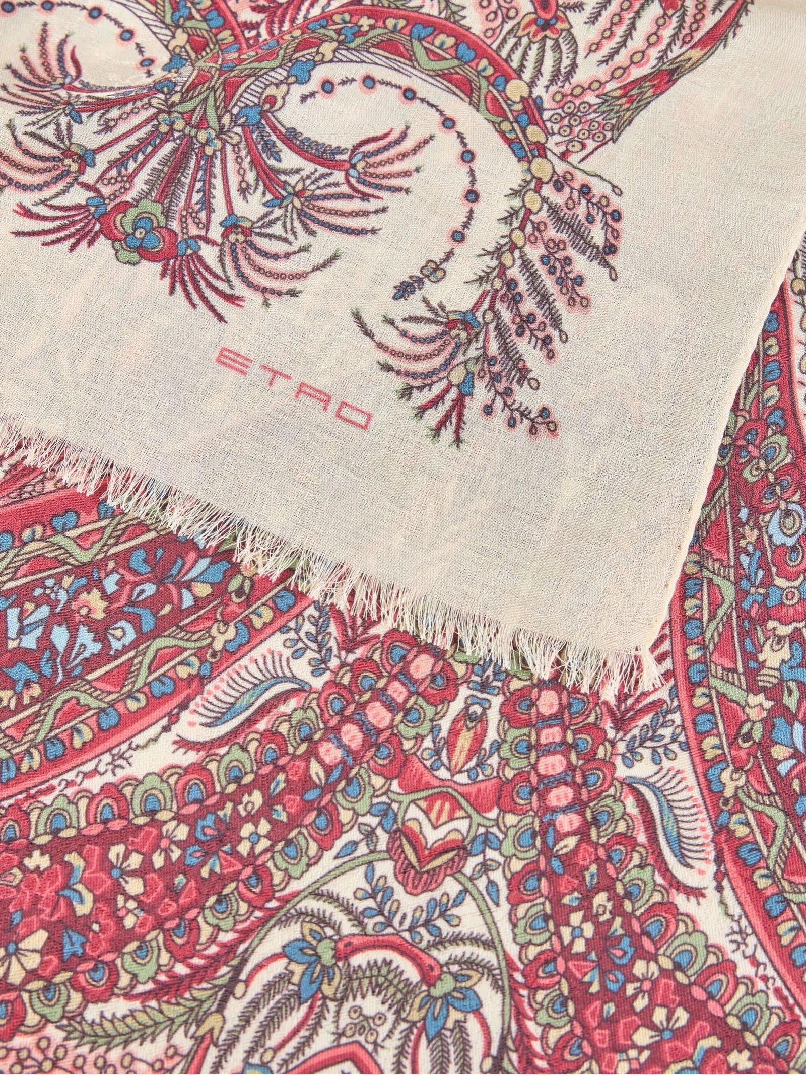 Scarf in mixed cashmere featuring a placed floral Paisley print, finished with lightly fringed short sides and Etro logo on the corner.