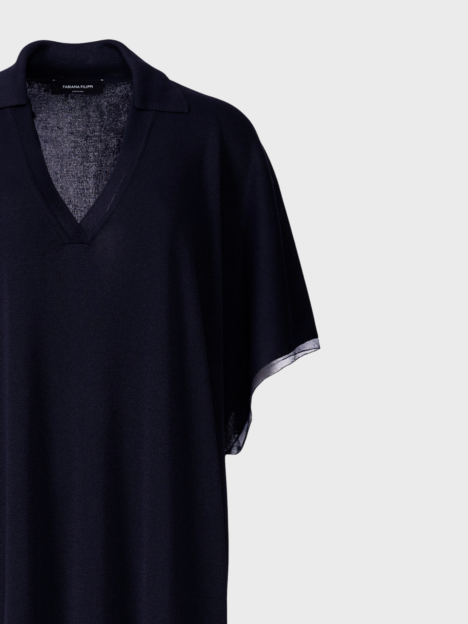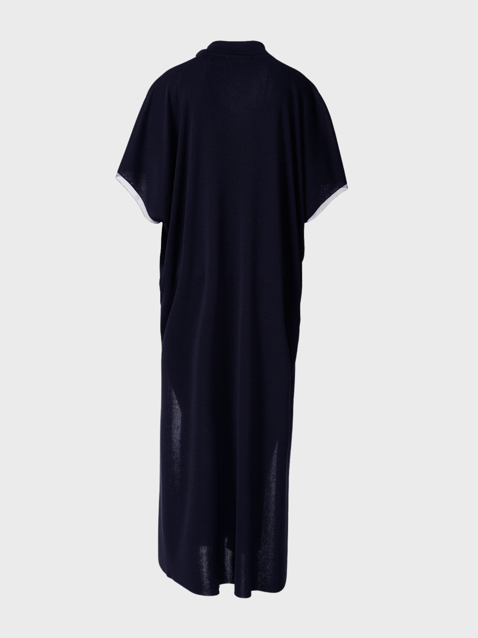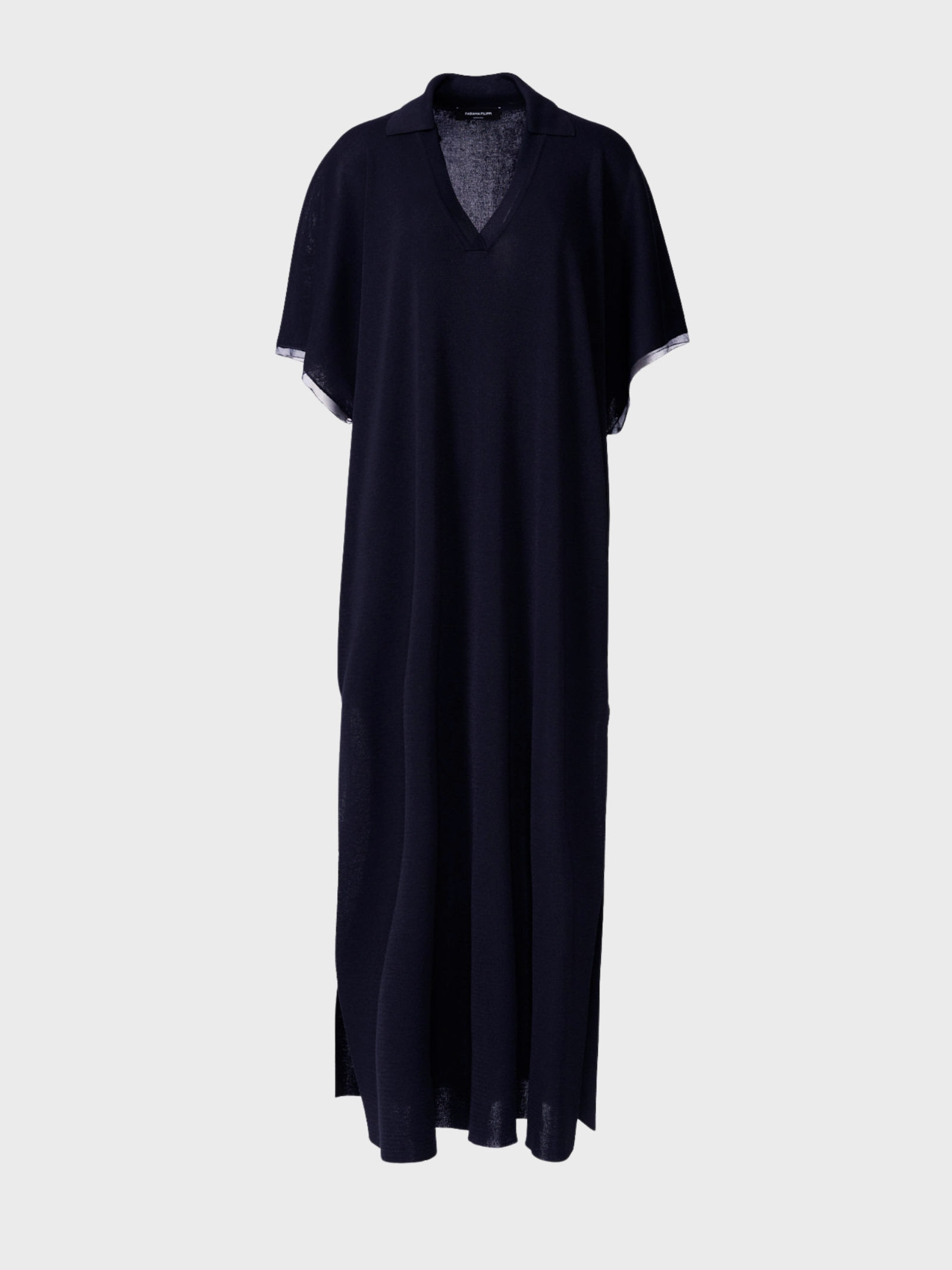 Caftan dress crafted from lightweight viscose using a new yarn with a silky hand and luminous finish, expressing refined and feminine elegance. The tight stitch construction reinterprets the classic caftan with a contemporary approach, while the floating diamond thread on the cuffs adds a subtle and sophisticated touch of light. Made in Italy through sustainable processes.