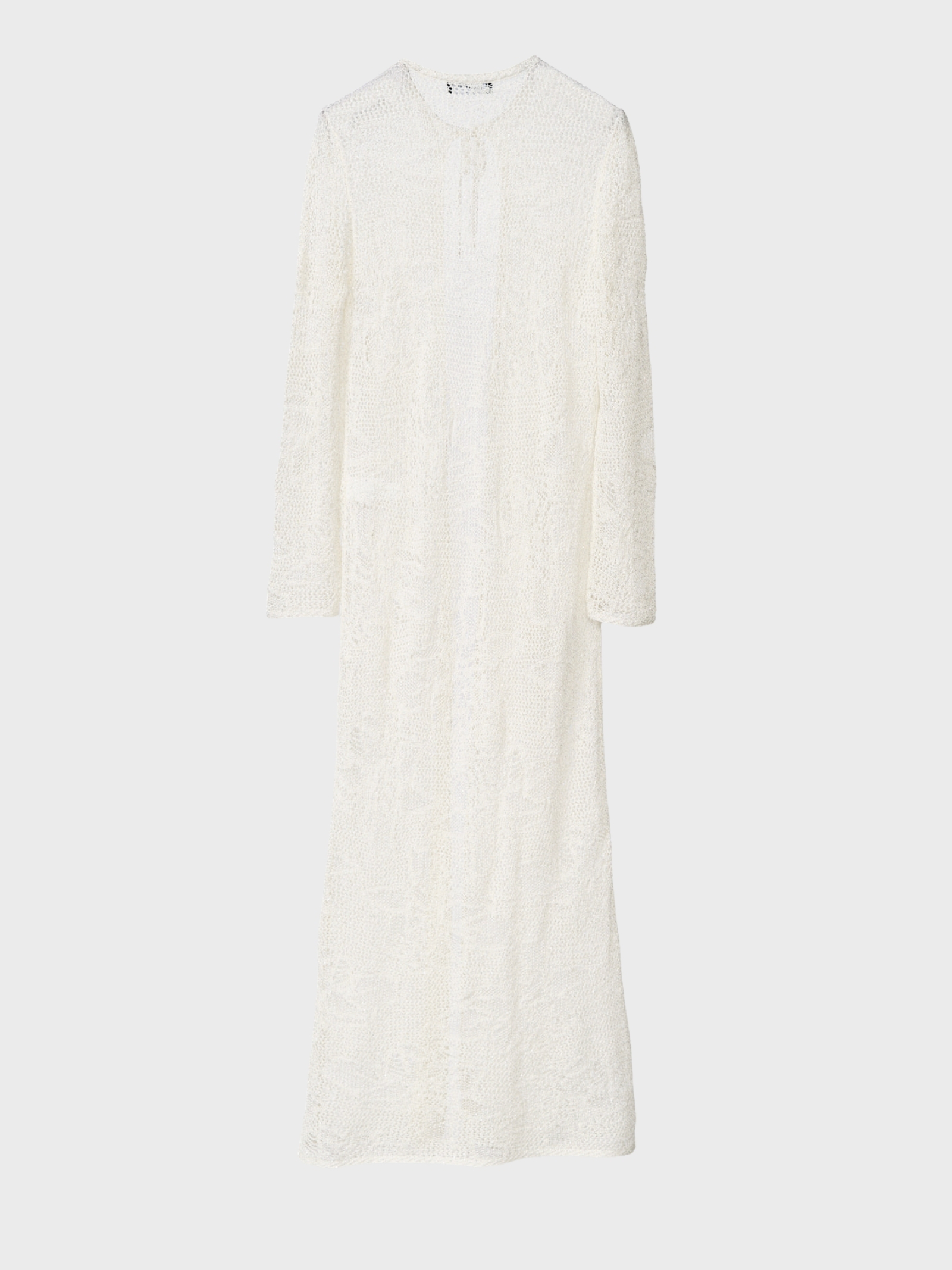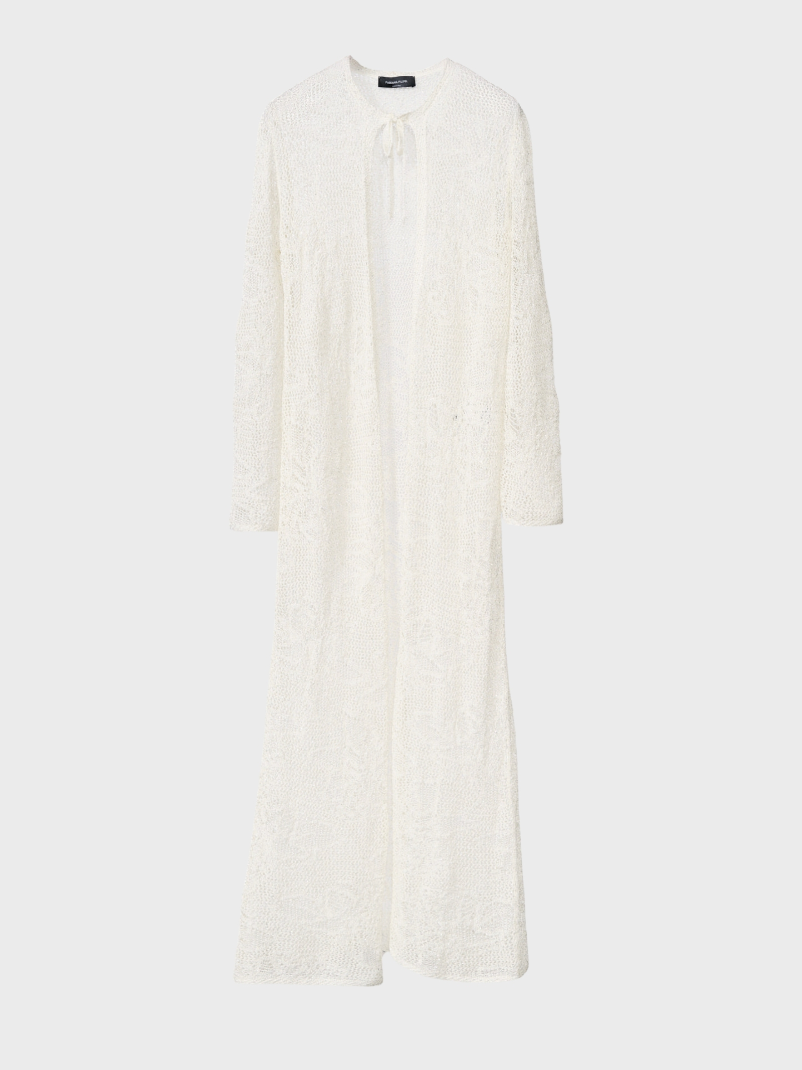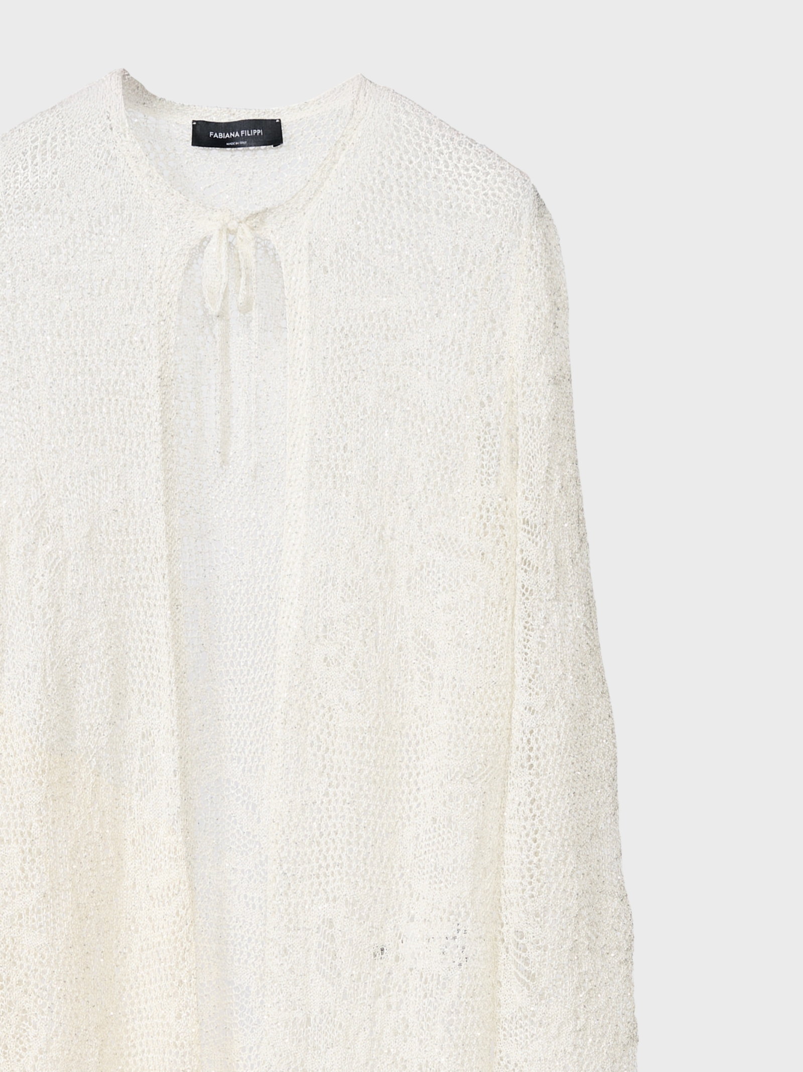 Long crew neck cardigan crafted from an innovative yarn enriched with micro sequins that create a sophisticated shine and a delicate lace like effect. The essential design and elegant silhouette make it a refined and contemporary piece, perfect for completing both everyday and more elevated looks. Entirely made in Italy through sustainable processes.