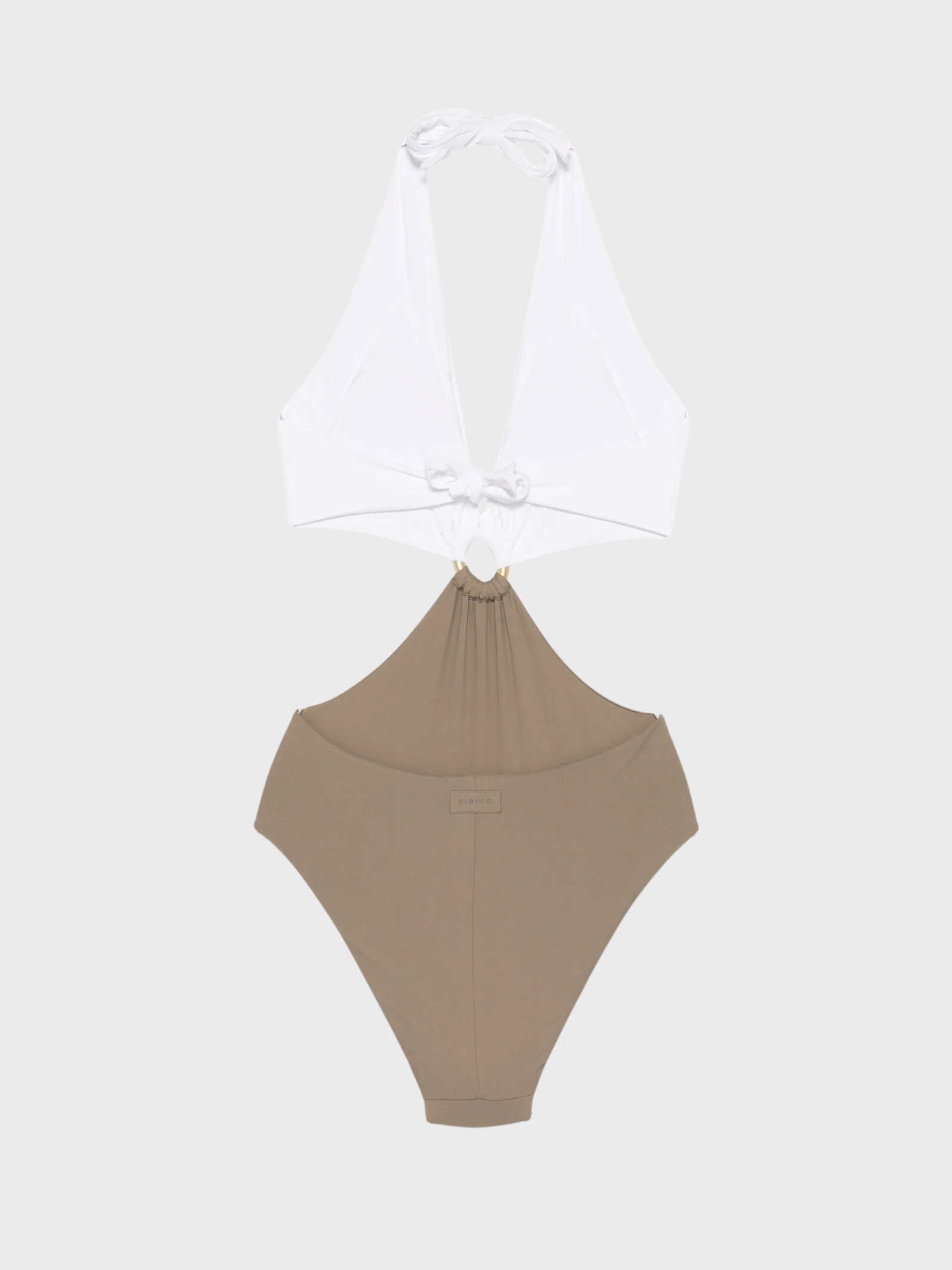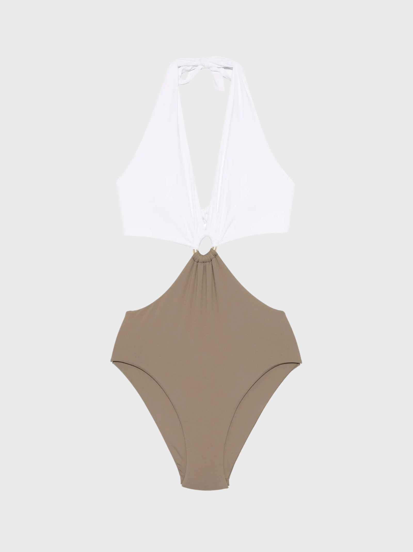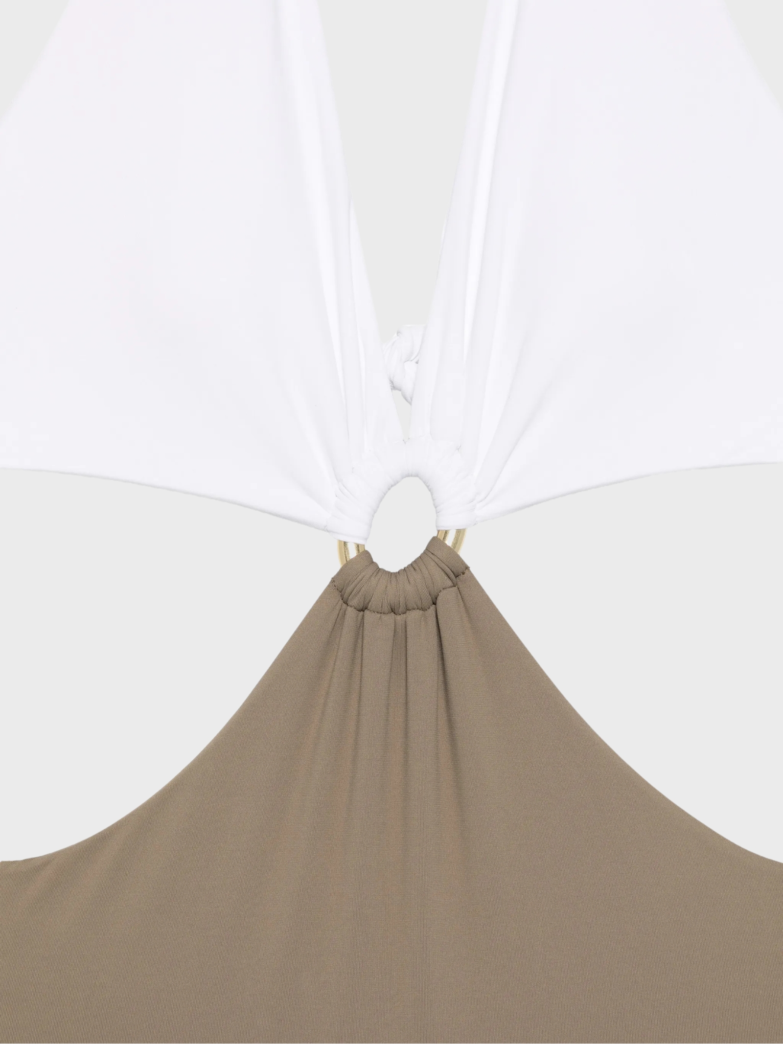 Bicolor microfiber trikini with a modern and feminine design. The halter neckline enhances the shoulders, while the central gold ring adds an elegant and luminous touch. Perfect for a standout beach or poolside look.