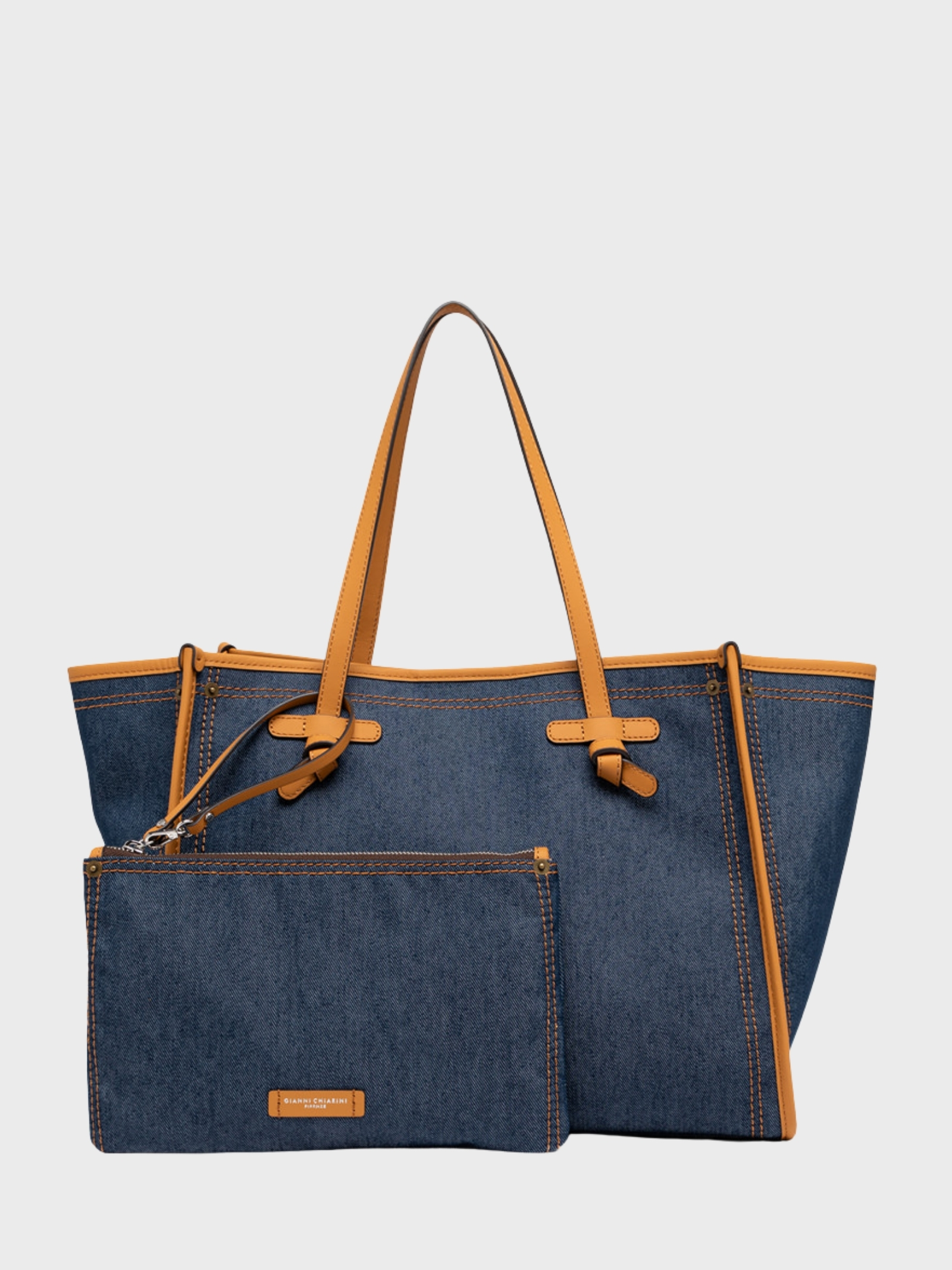 The Marcella by Gianni Chiarini Firenze shopping bag is crafted from lightweight and durable denim-effect fabric, perfect for everyday use. Leather trims and handles add a touch of elegance to its casual design, creating a refined textural contrast. Featuring a practical magnetic closure and a matching denim pouch, it is a versatile accessory designed to complement even the most essential looks with style and functionality.