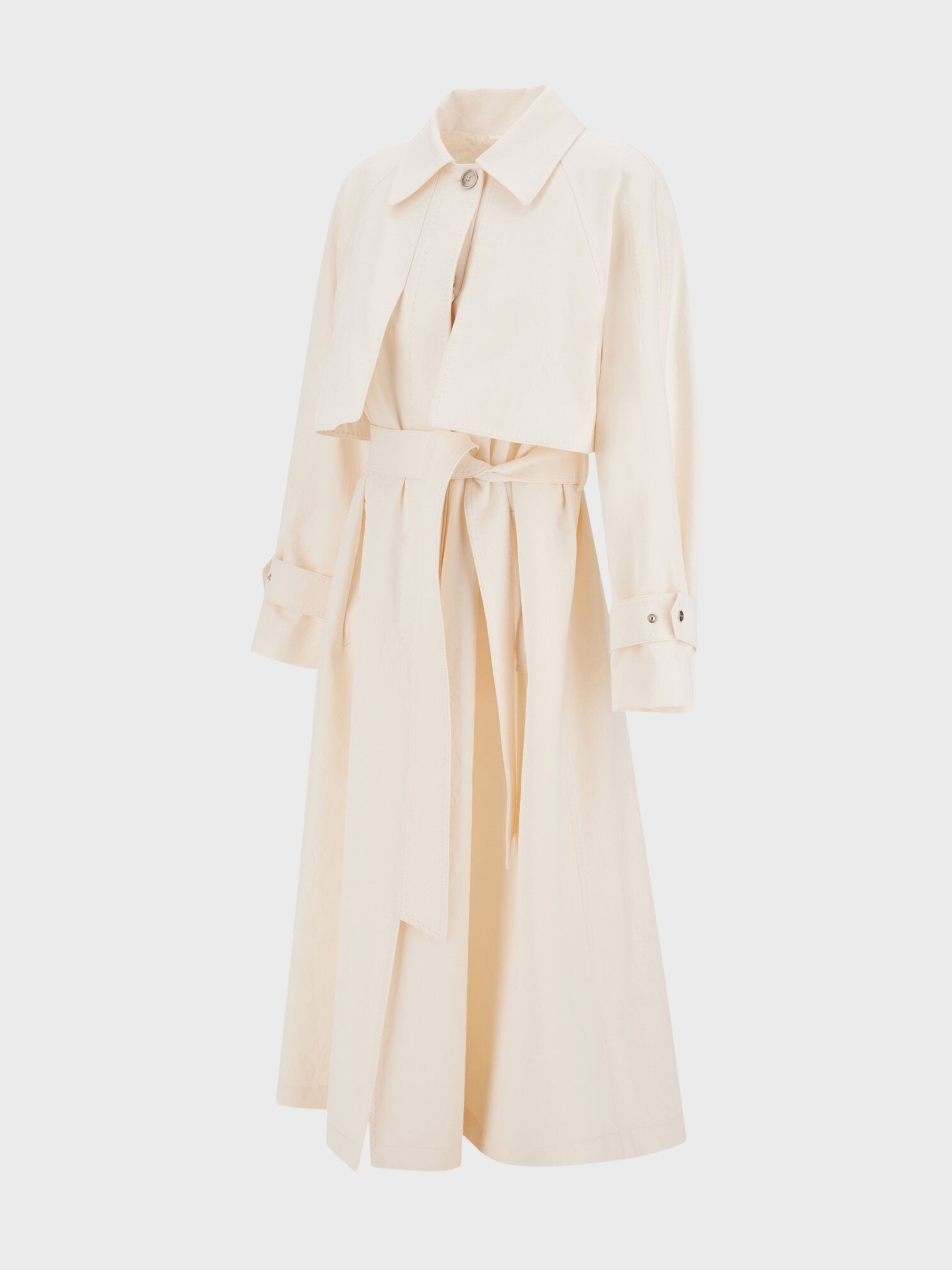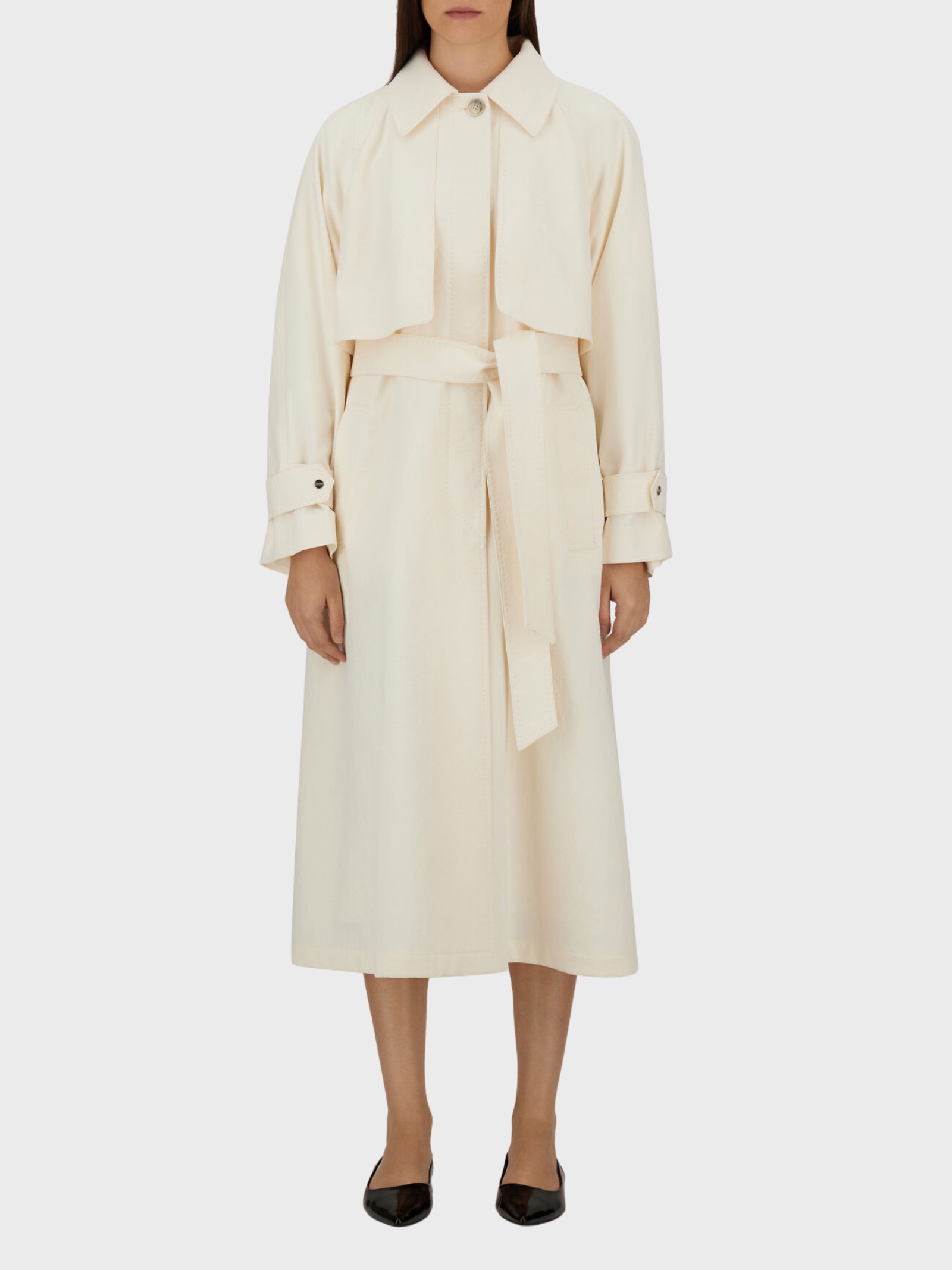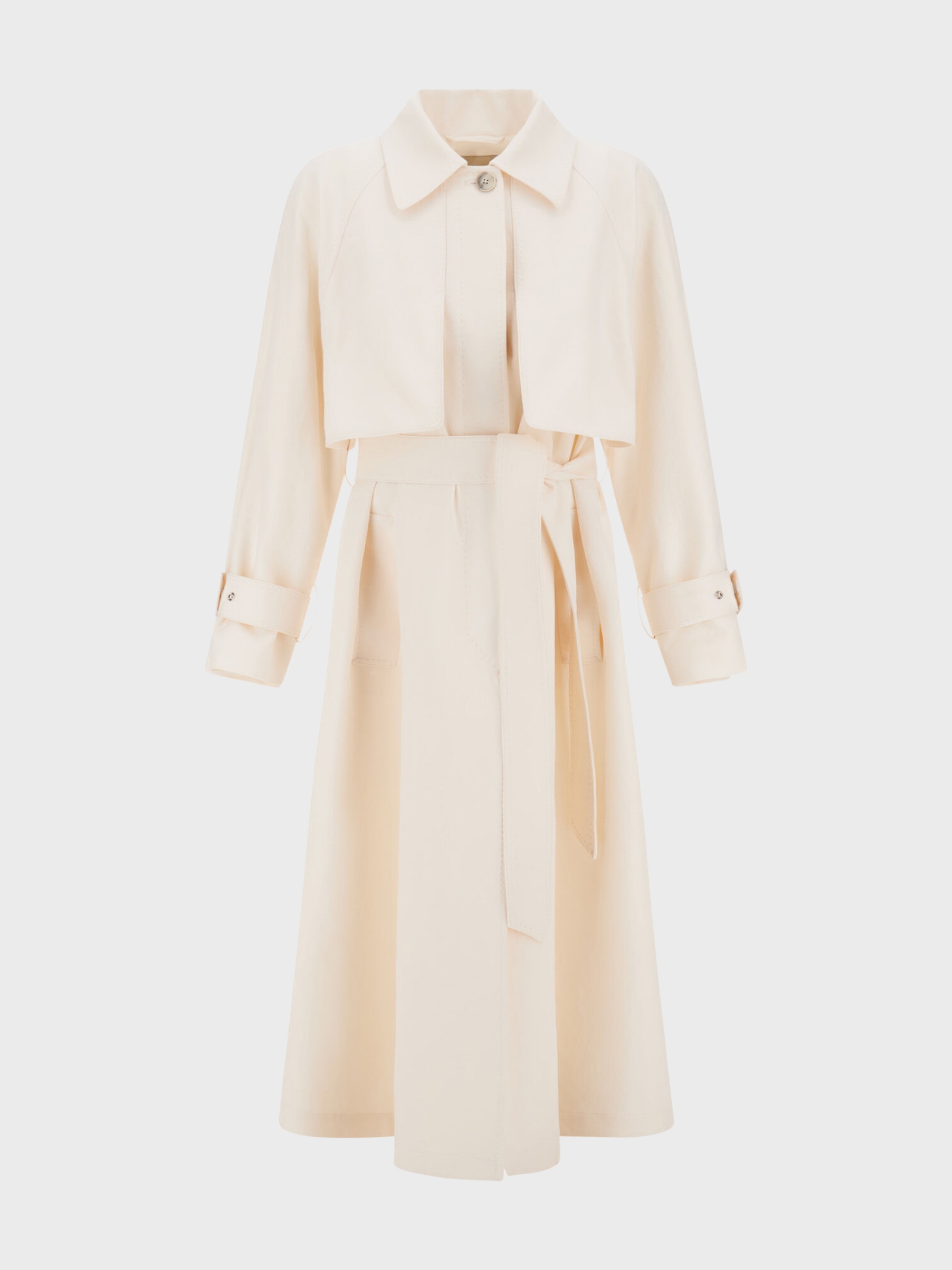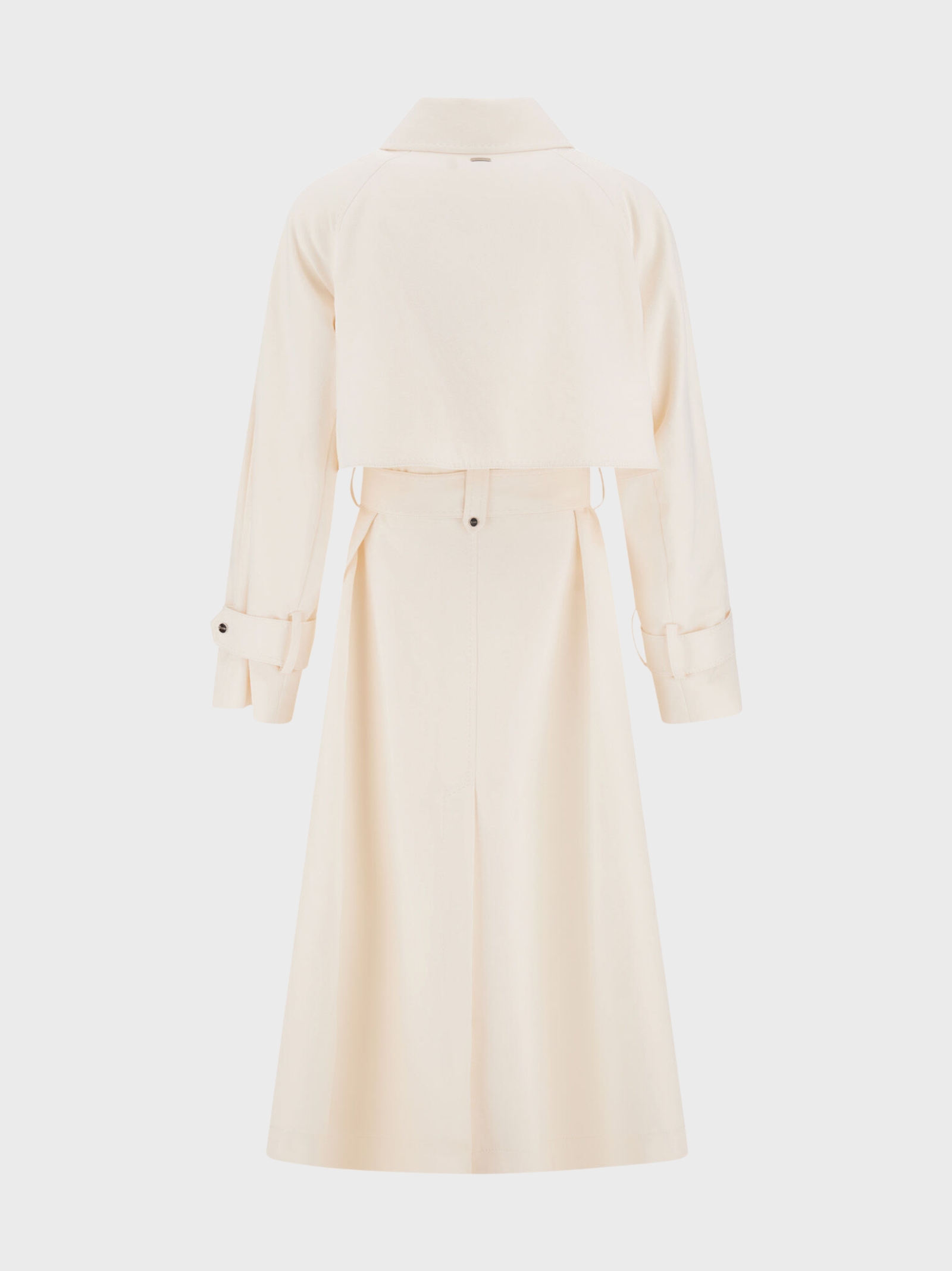 Double-breasted trench coat made from polyester with a dry and fresh hand feel, featuring a slightly textured effect. Inspired by classic tailoring, it is reinterpreted with a fluid yet elegant fit, perfect for layered looks with strong character.