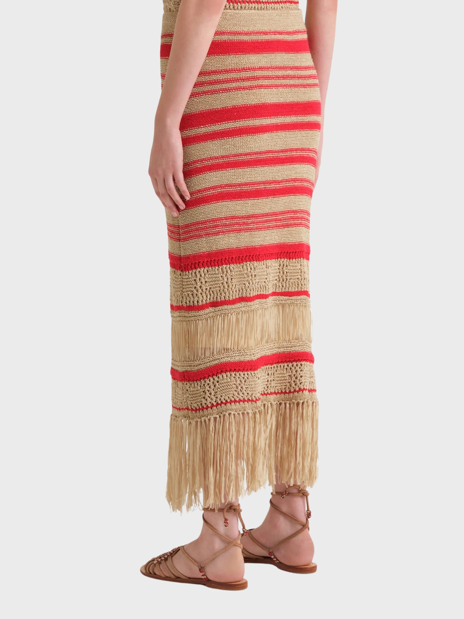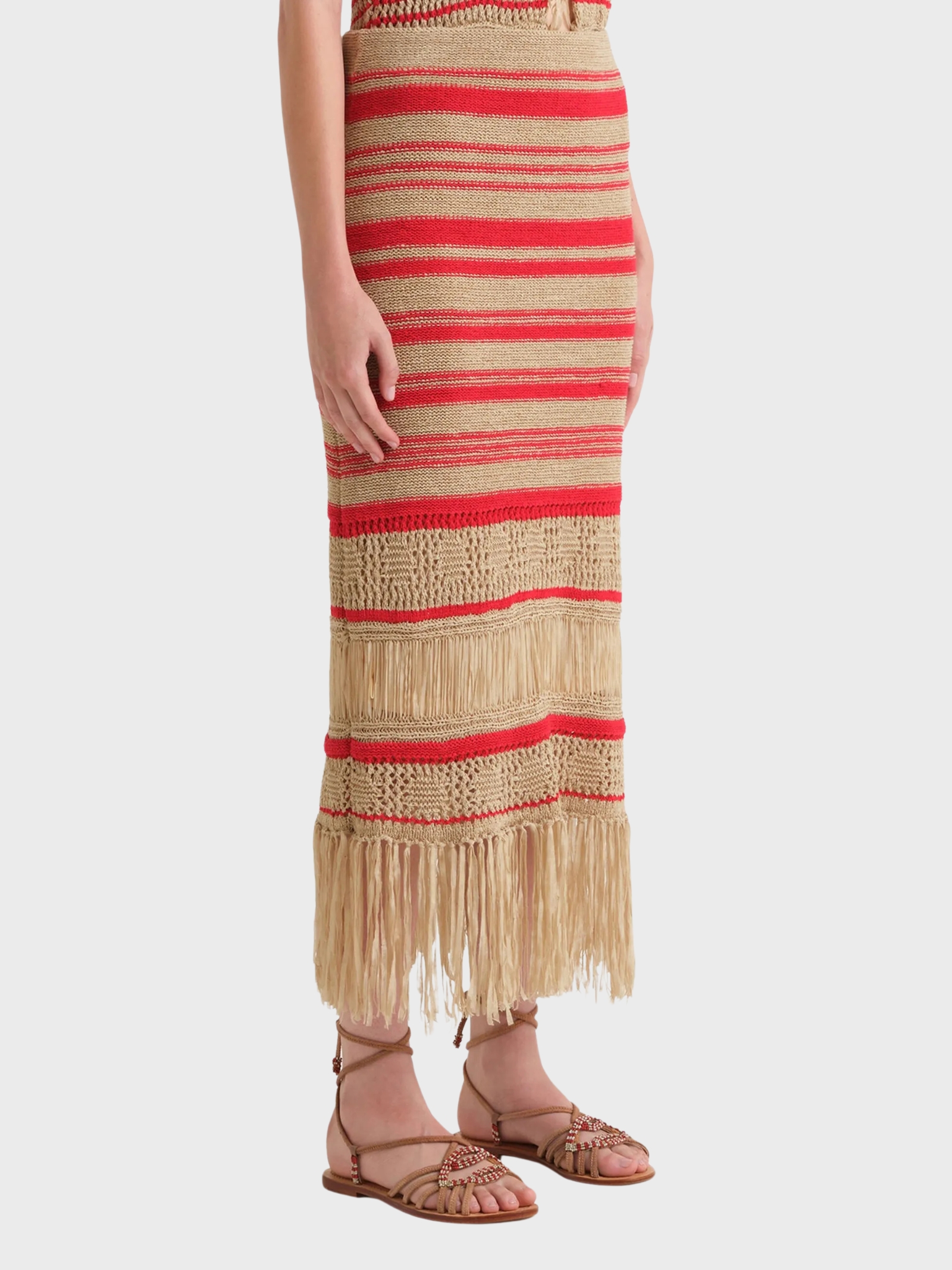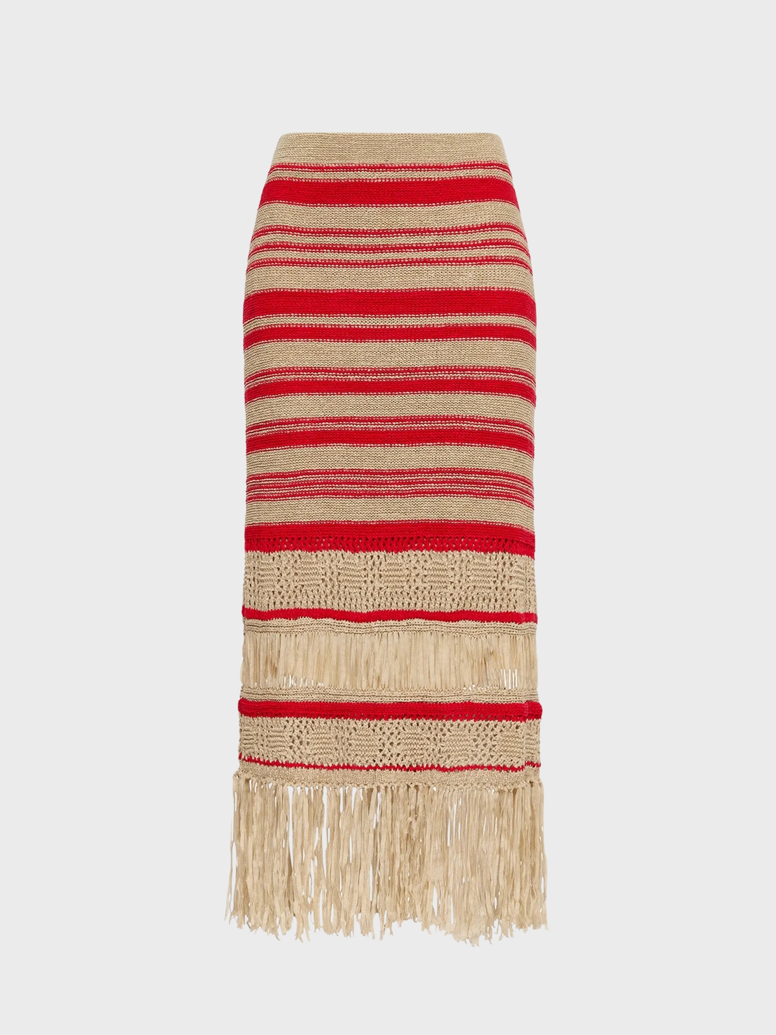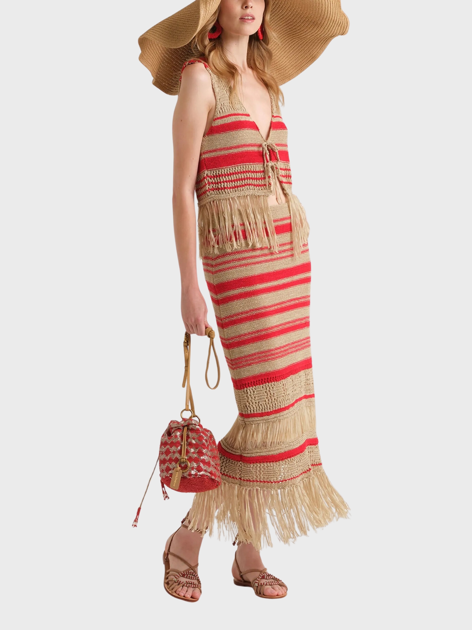 Midi skirt with an artisanal character, crafted by combining two different textures in a refined three-dimensional effect. The upper part, up to the knee, is hand-woven with subtly contrasting tones that create a unique textured look. The hem is finished with long ribbon fringes that move gracefully with every step. A flat waistband with internal elastic ensures comfort and fit, while the jersey lining provides a soft feel against the skin. A boho-chic inspired piece, perfect for sophisticated summer styling.
