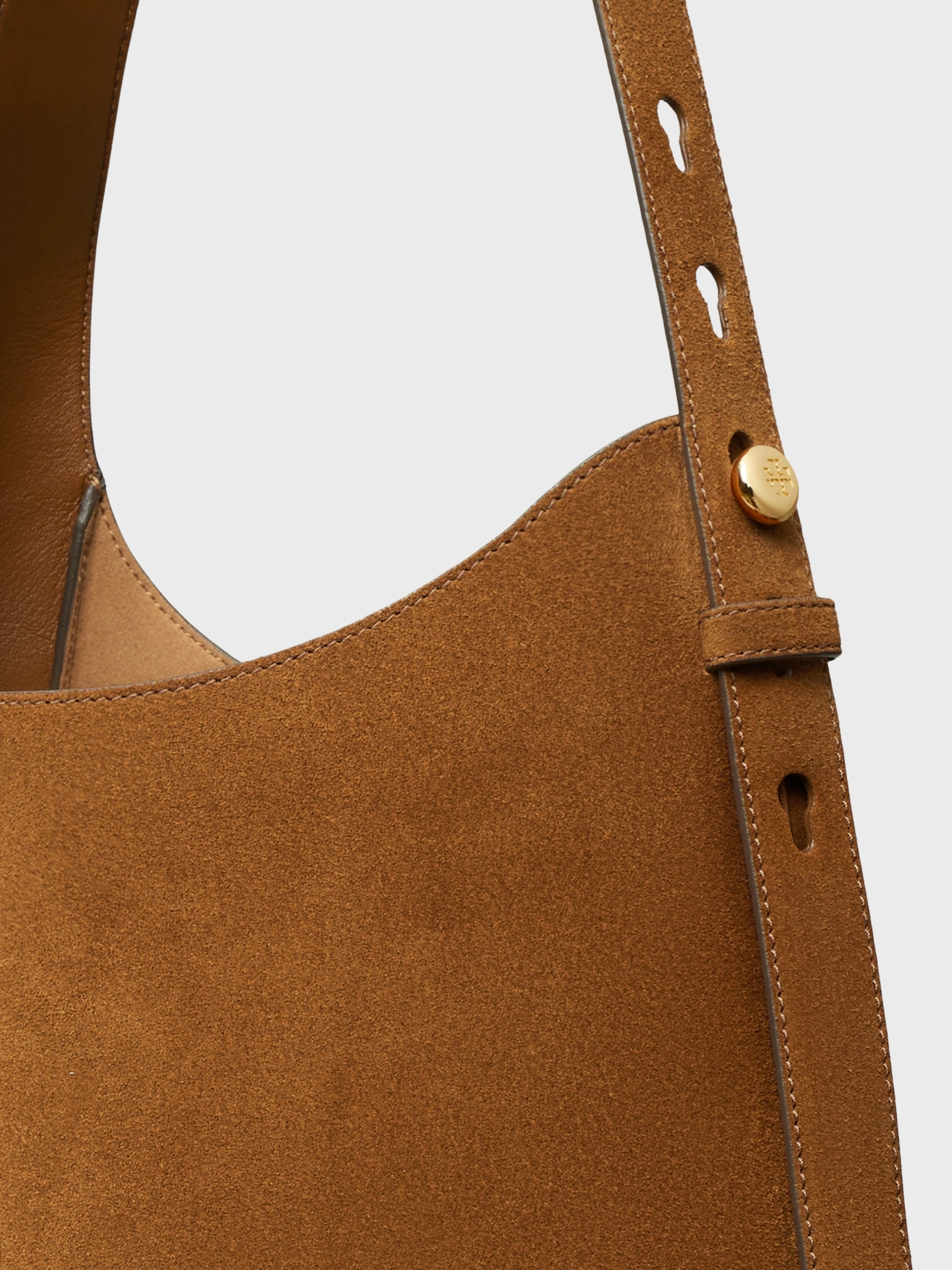 The hobo bag is crafted from soft suede and stands out for its lightweight and practical design; ideal for everyday use, it features a spacious interior with a zip pocket and is completed by a slim adjustable strap and logo button.