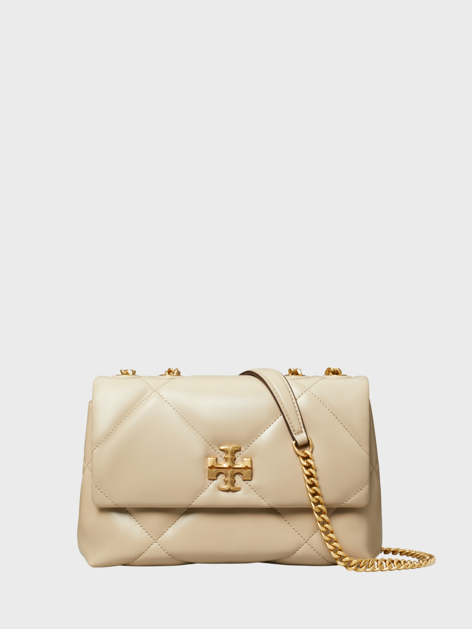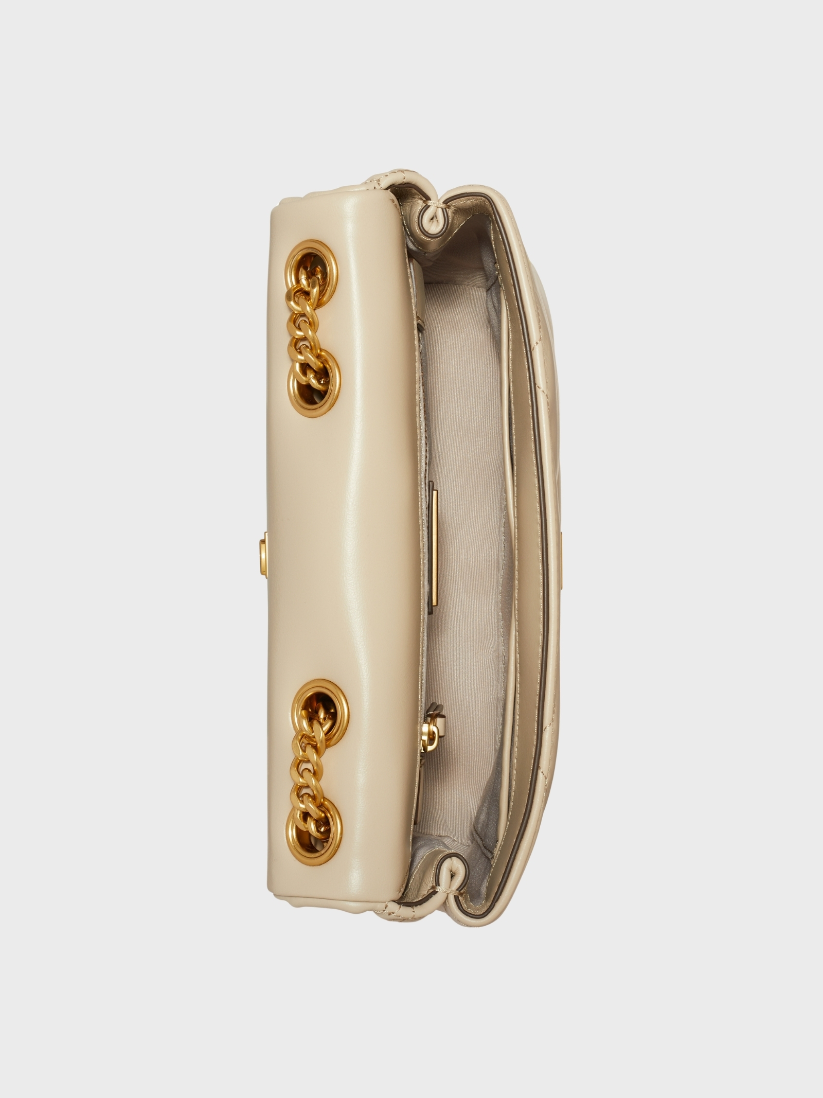 The small convertible shoulder bag stands out for its diamond quilting and soft matelassé finish; its classic shape is enhanced by the double T detail and a versatile adjustable chain strap, allowing it to be worn on the shoulder or crossbody.
