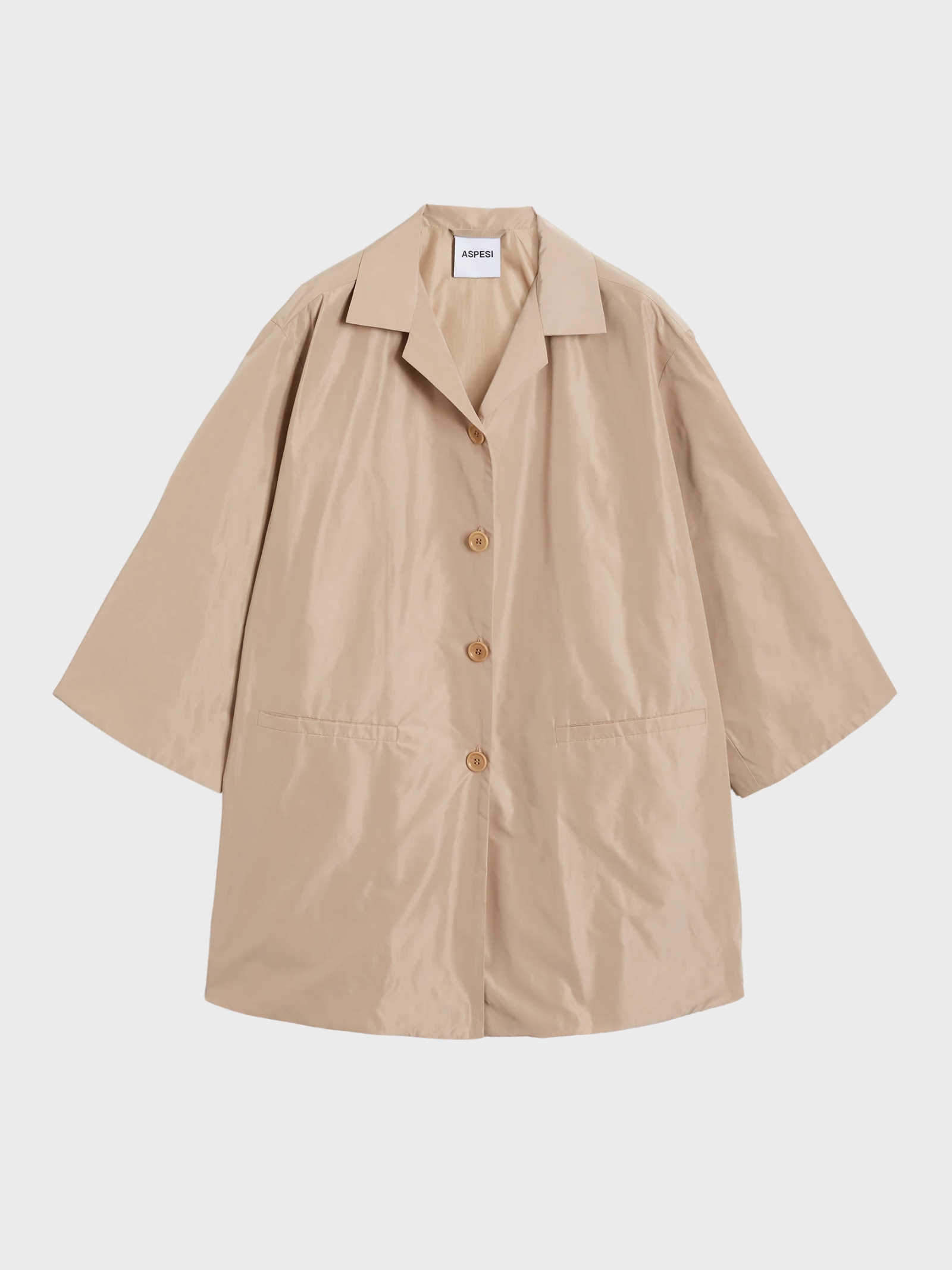 Soprabito dal design elegante e contemporaneo, realizzato in taffetas di poliestere tecnico e foderato in nylon leggero. Collo e rever classici, chiusura con bottoni e asole, maniche 7/8 e tasche con filetto completano il capo con dettagli raffinati. Vestibilità ampia per comfort e libertà di movimento.
