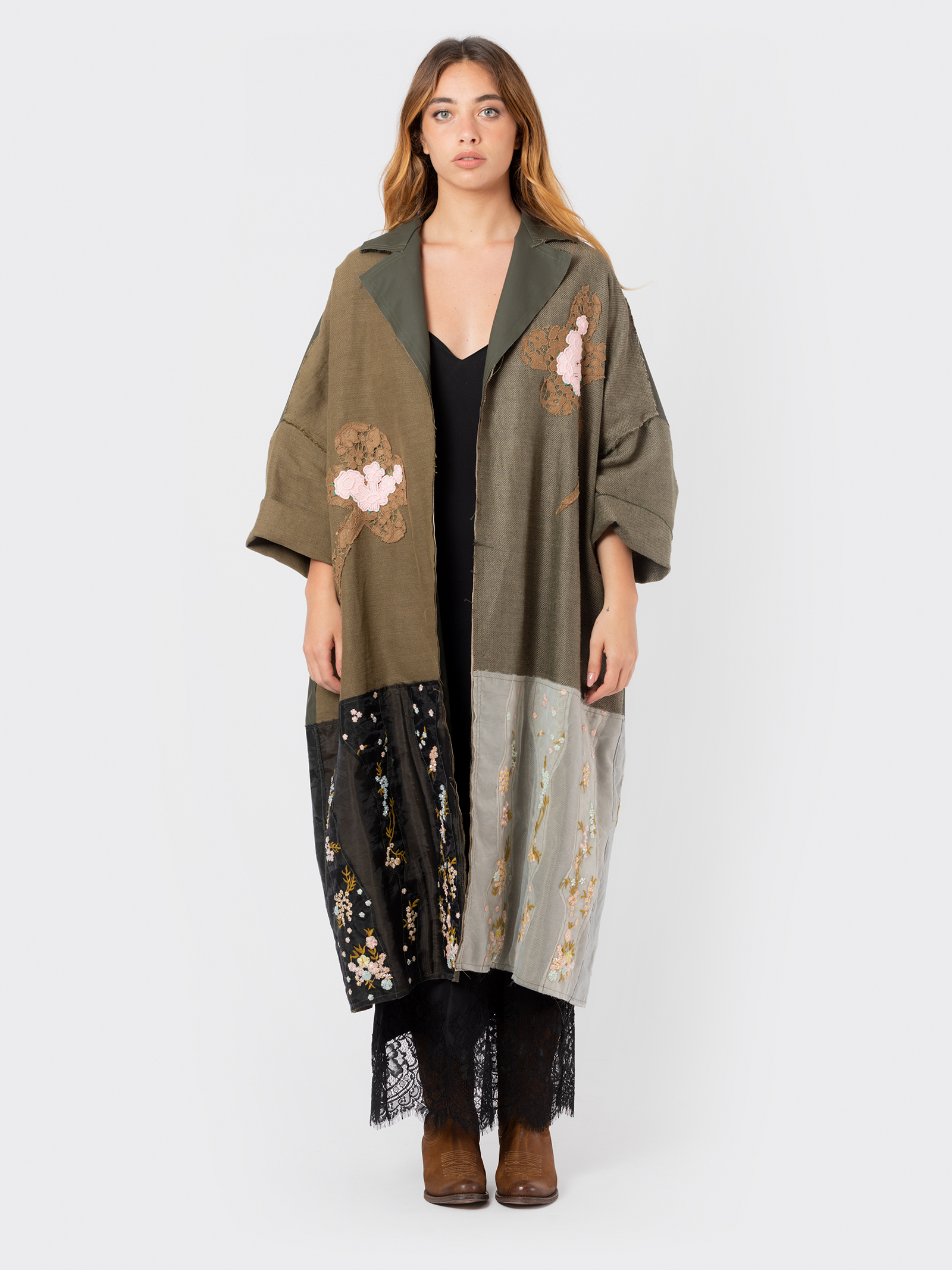 Soprabito over lungo Ermanno Gallamini realizzato in lino e cotone con inserti di ricamo.