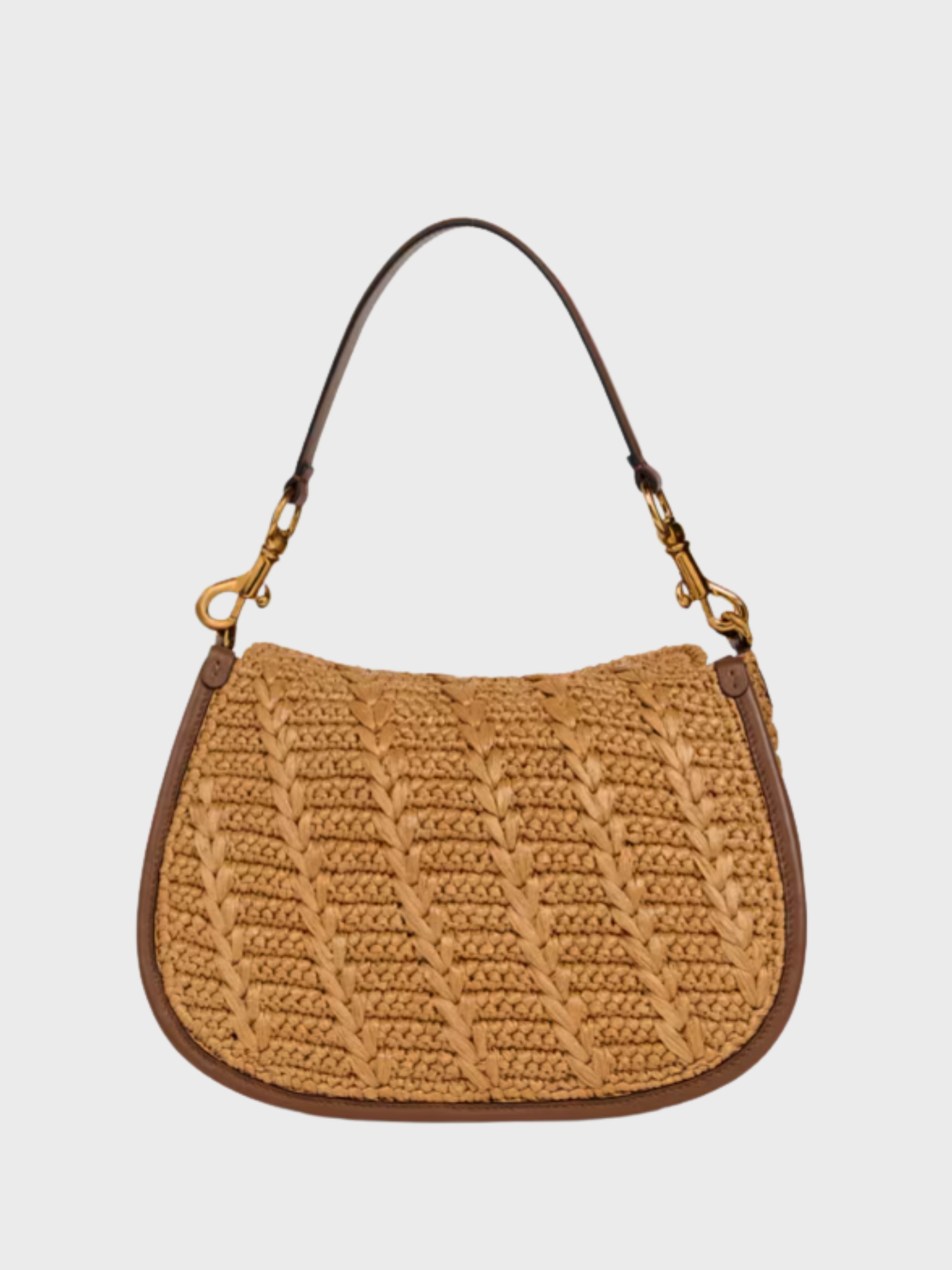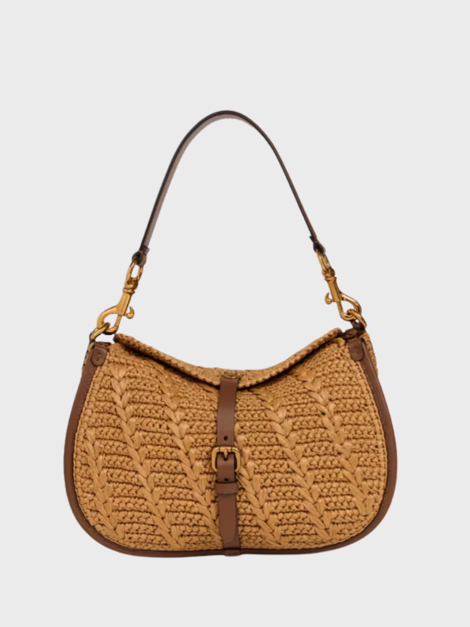 Borsa Pony dalle linee morbide, realizzata in rafia crochet intrecciata e arricchita da dettagli in pelle. Il modello presenta una doppia chiusura, con bottone magnetico decorato dalla moneta in metallo con Pegaso ottenuta tramite coniatura, e una seconda chiusura con fibbia metallica funzionale. Dotata di manico e tracolla intercambiabili, consente una portabilità a mano, a spalla o crossbody, con elegante dettaglio Paisley in corrispondenza dei moschettoni. Gli accessori metallici con finitura dorata completano il design con un tocco raffinato.