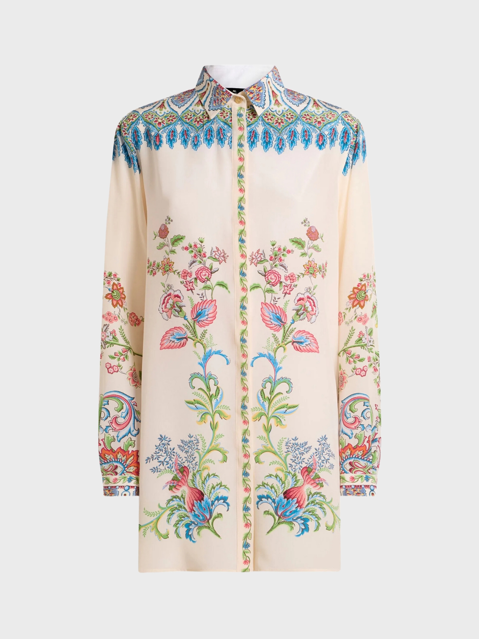 Camicia dalla linea lunga e morbida, realizzata in pura seta, caratterizzata da una stampa floreale piazzata e da un motivo medaglioni sul colletto e sul carré anteriore e posteriore. Una sottile fantasia a fiori arricchisce la chiusura, conferendo al modello uneleganza raffinata e femminile. Il design prevede maniche lunghe con polsini a bottone, spacchi laterali e chiusura con bottoni nascosti con primo bottone visibile.