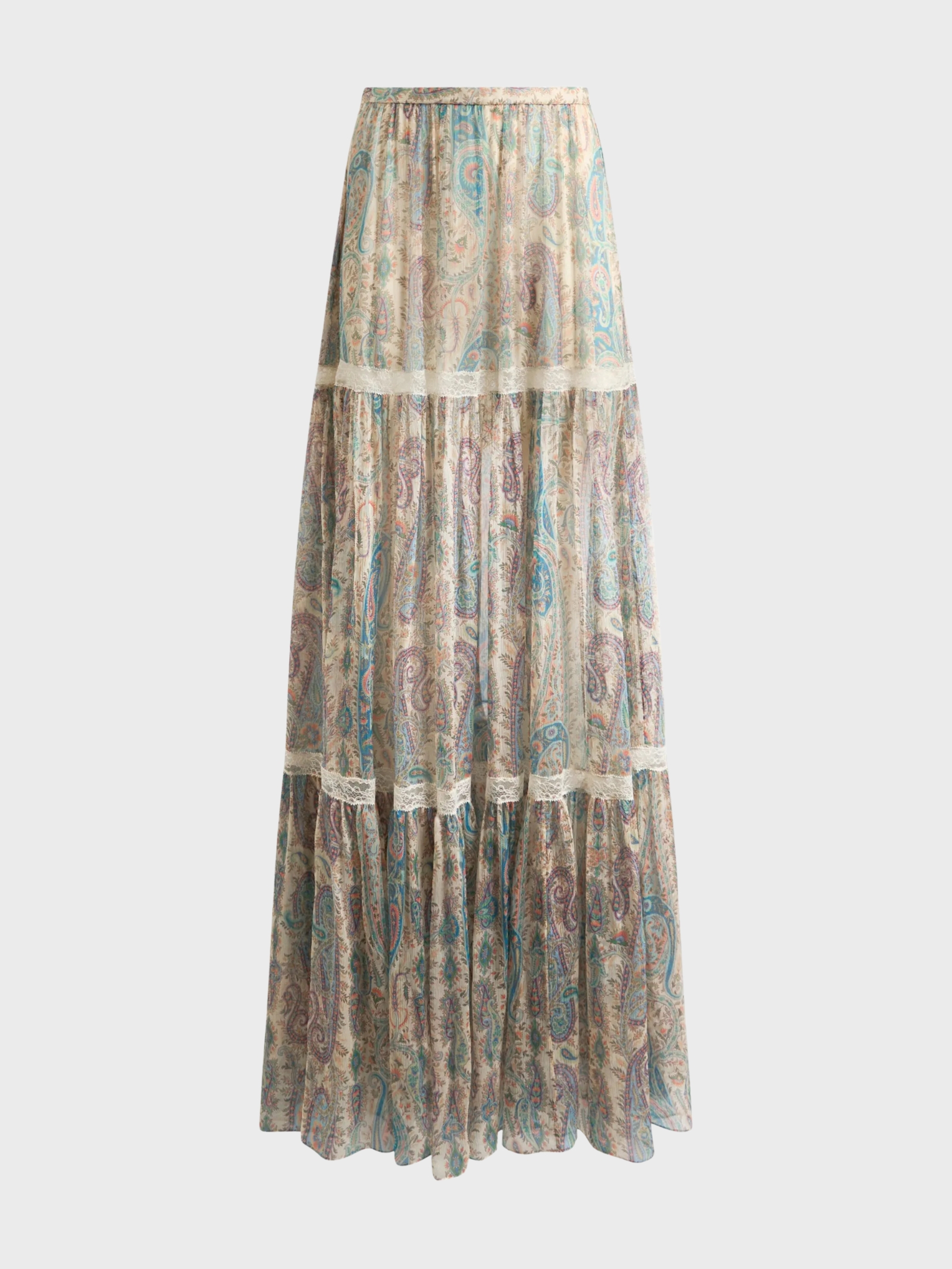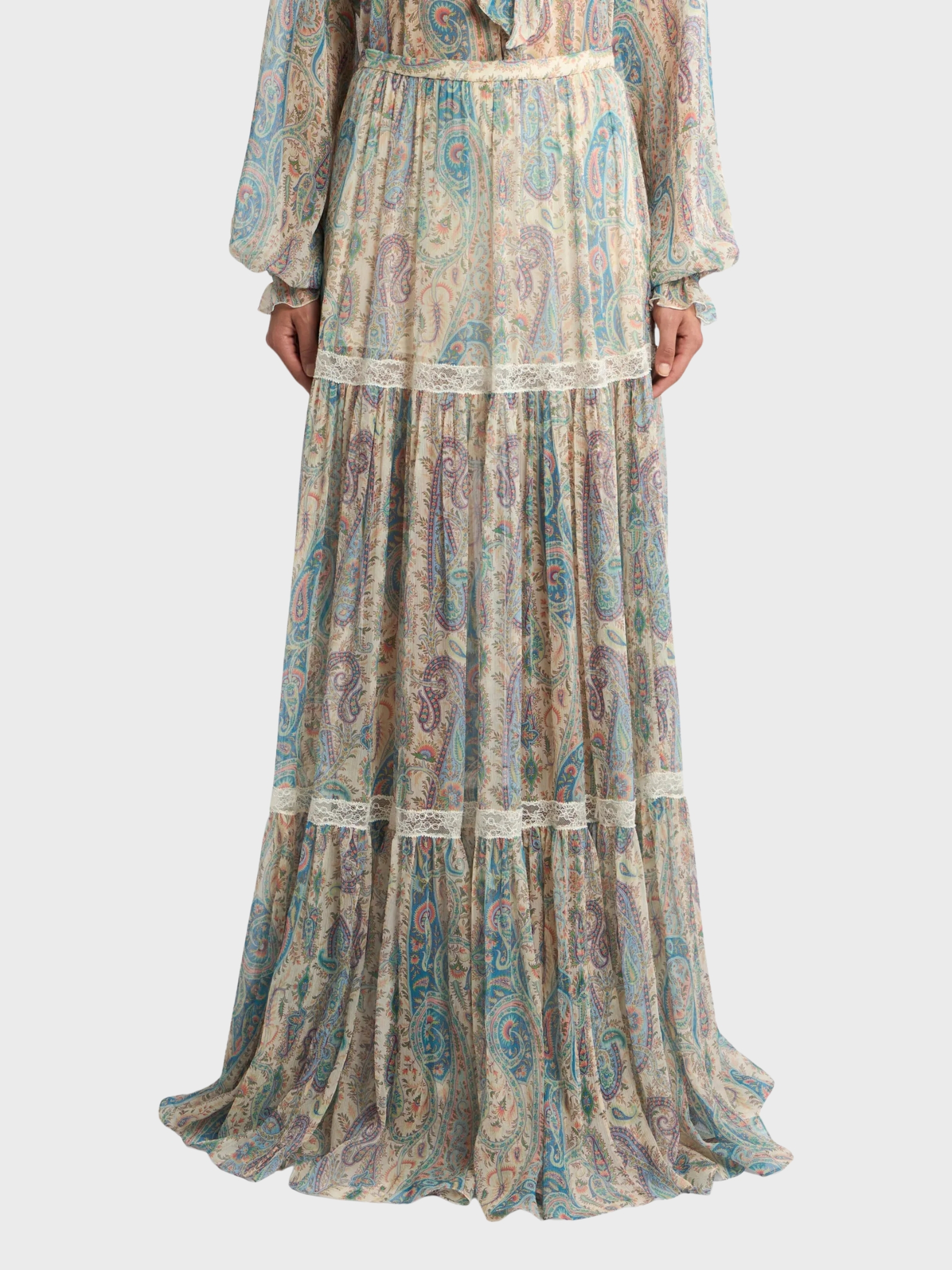 Gonna lunga in seta con motivo Paisley e balze in pizzo
