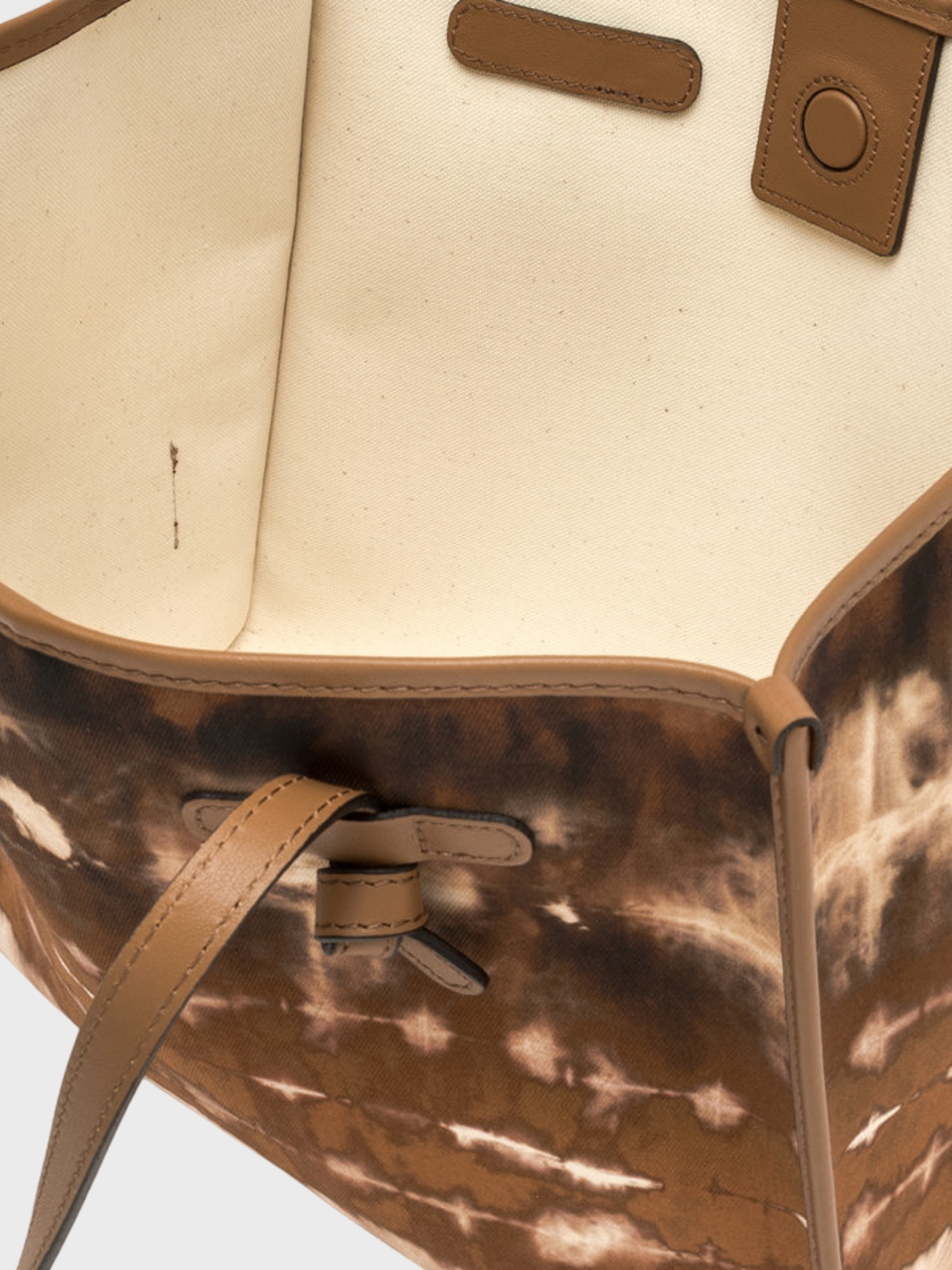 Shopping bag in tessuto semilucido con stampa tie-dye dal design minimale, impreziosita da profili e manici in pelle tono su tono. Completa di chiusura magnetica, pochette coordinata e fodera interna a contrasto, perfetta per la vita quotidiana con un tocco di stile e vitalità.