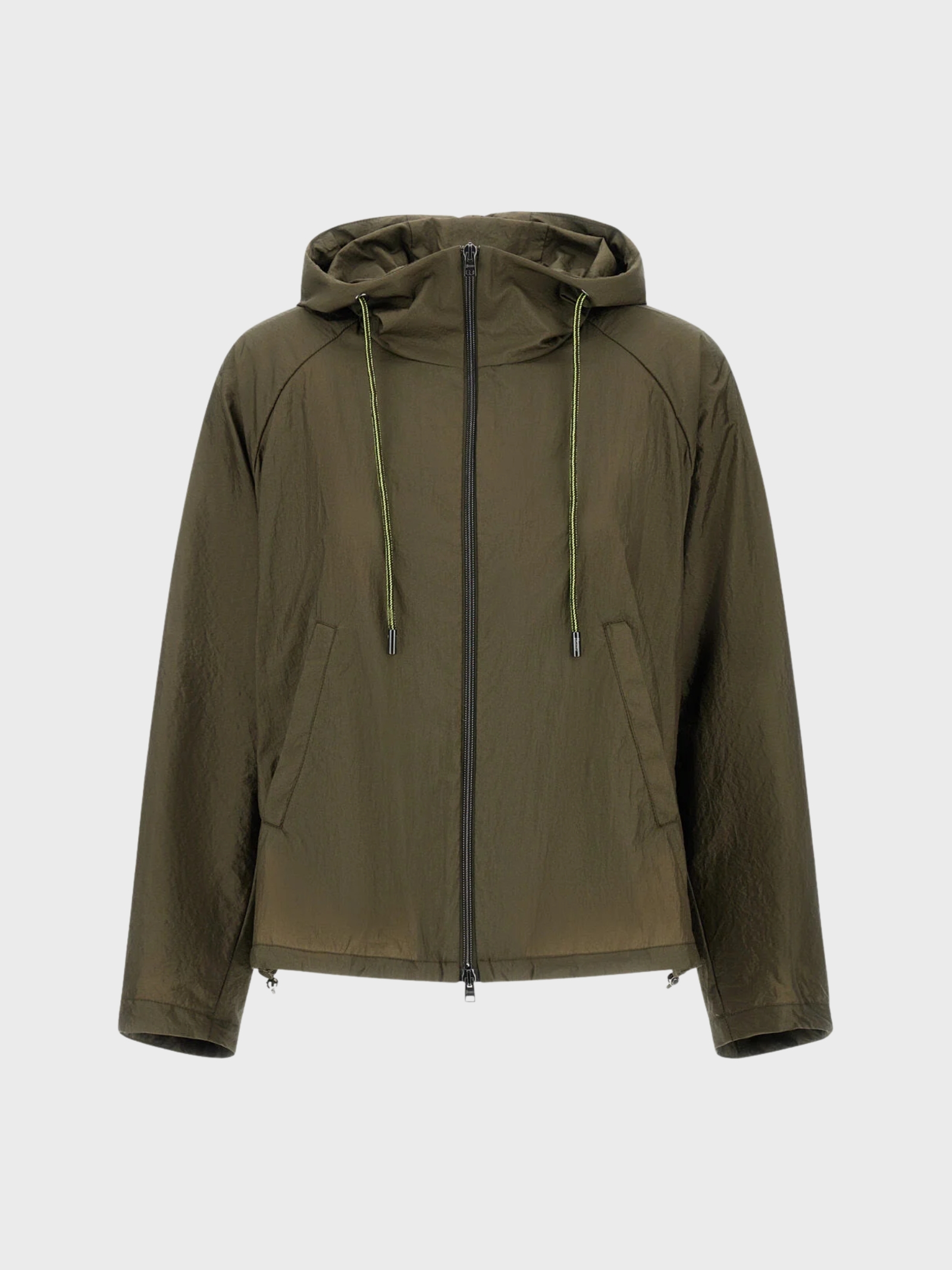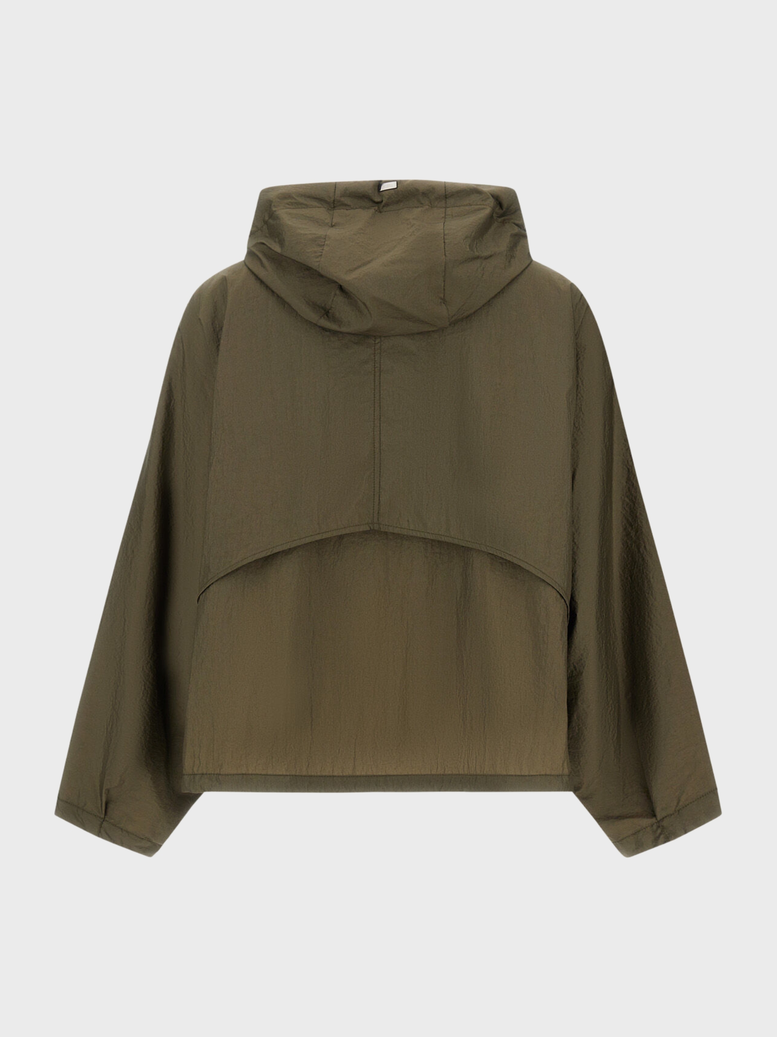 Giacca realizzata in tessuto tecnico 20 denari trattato per ottenere un raffinato effetto metallico. Il materiale è leggero e compatto, ideale per la mezza stagione e per completare look quotidiani con una nota contemporanea. La vestibilità relaxed garantisce comfort e libertà di movimento, mentre le coulisse in gros grain al cappuccio e al fondo permettono di modulare il volume secondo le esigenze. Il design con maniche raglan a pipistrello accentua l'estetica moderna del capo. Modello sfoderato, perfetto per un utilizzo dinamico e urbano.