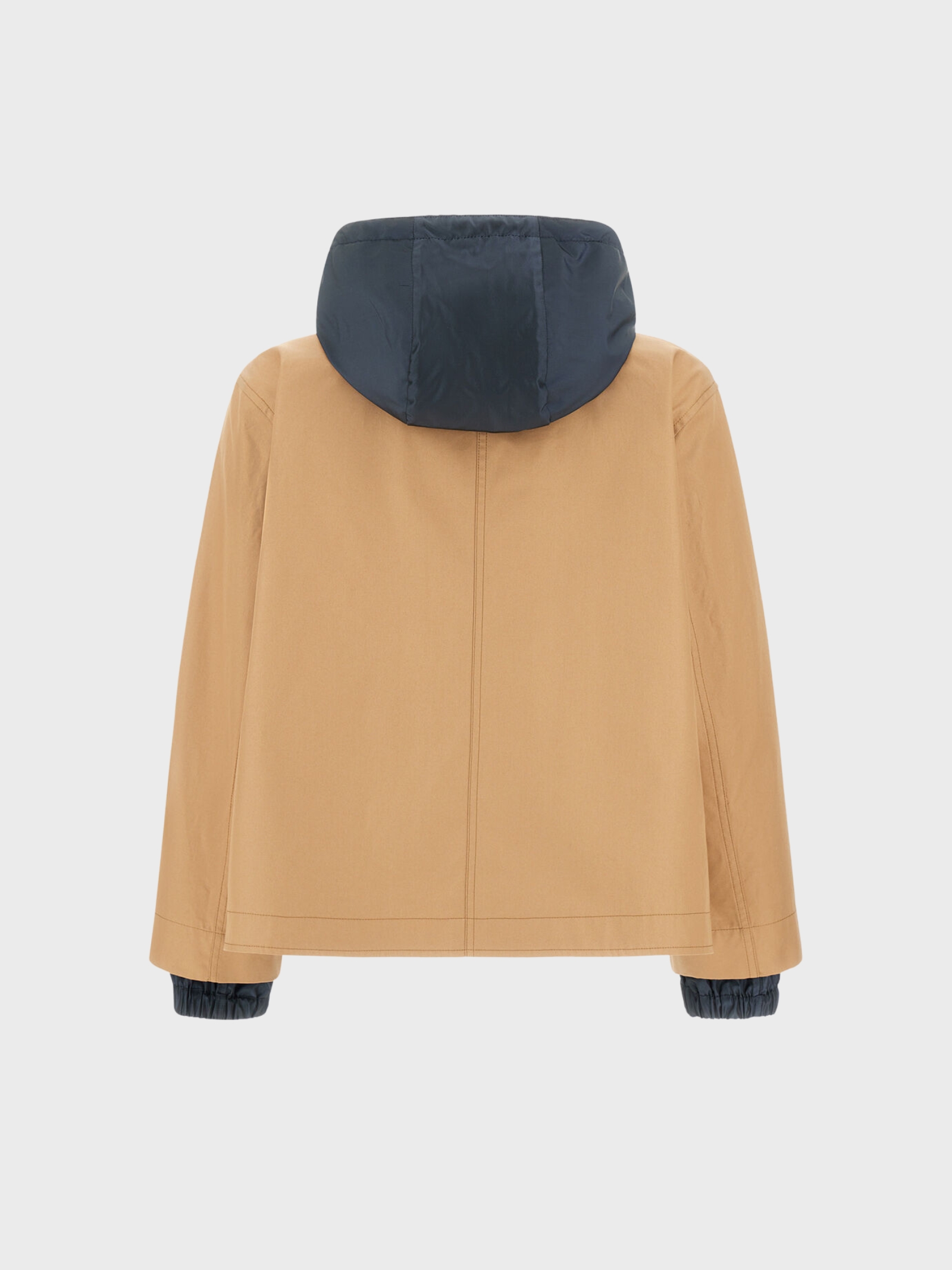 Giacca reversibile in gabardina di cotone tinto con finissaggio antigoccia. Essenziale e versatile, presenta una costruzione reversibile che permette di indossare due colori diversi, ampliando le possibilità di abbinamento. Modello con cappuccio e linea relaxed, perfetto per un look contemporaneo e funzionale.