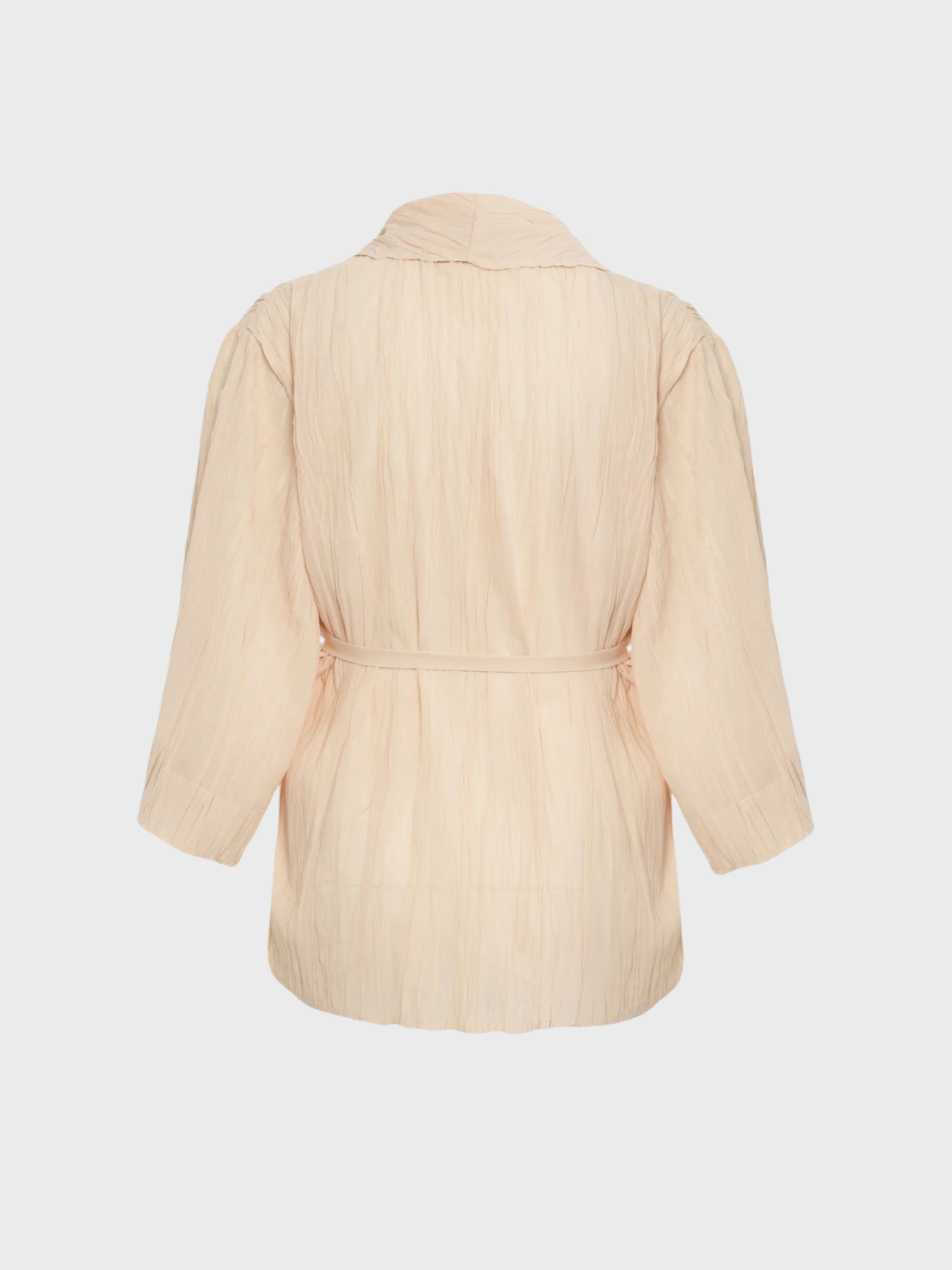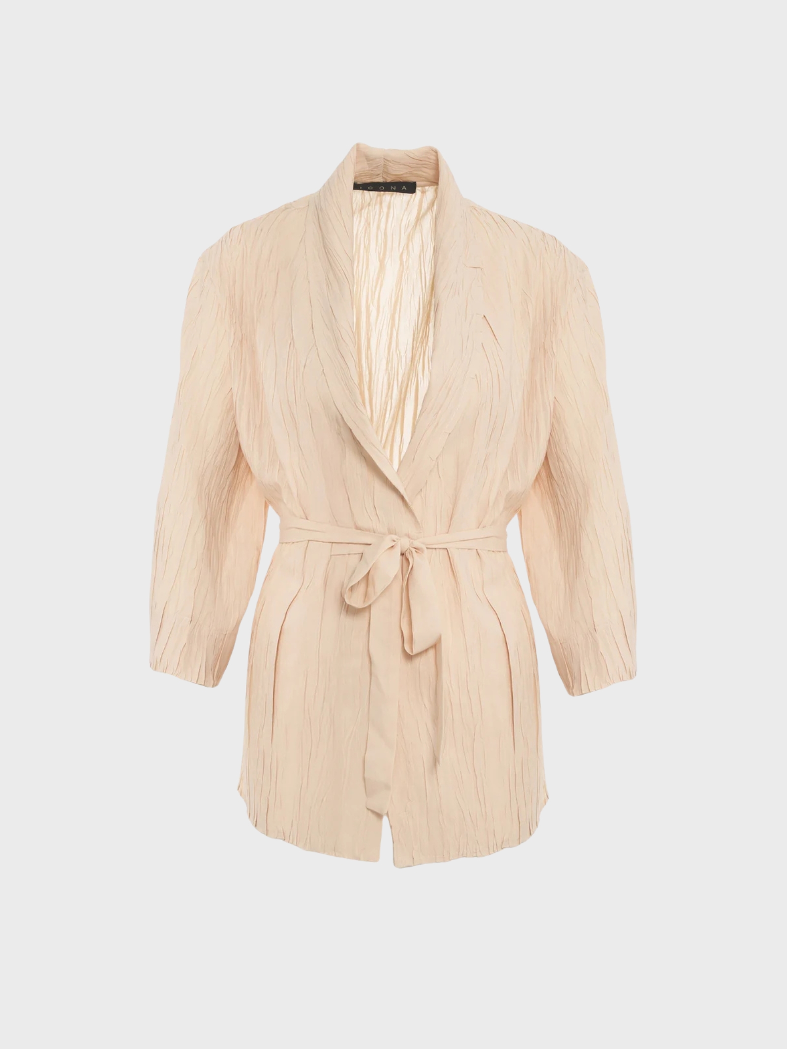 Giacca kimono elegante dalla linea fluida e lavorazione plissettata. Il collo a scialle e la cintura in vita da annodare valorizzano la silhouette con femminilità e raffinatezza. Le maniche a tre quarti aggiungono un tocco moderno e leggero.