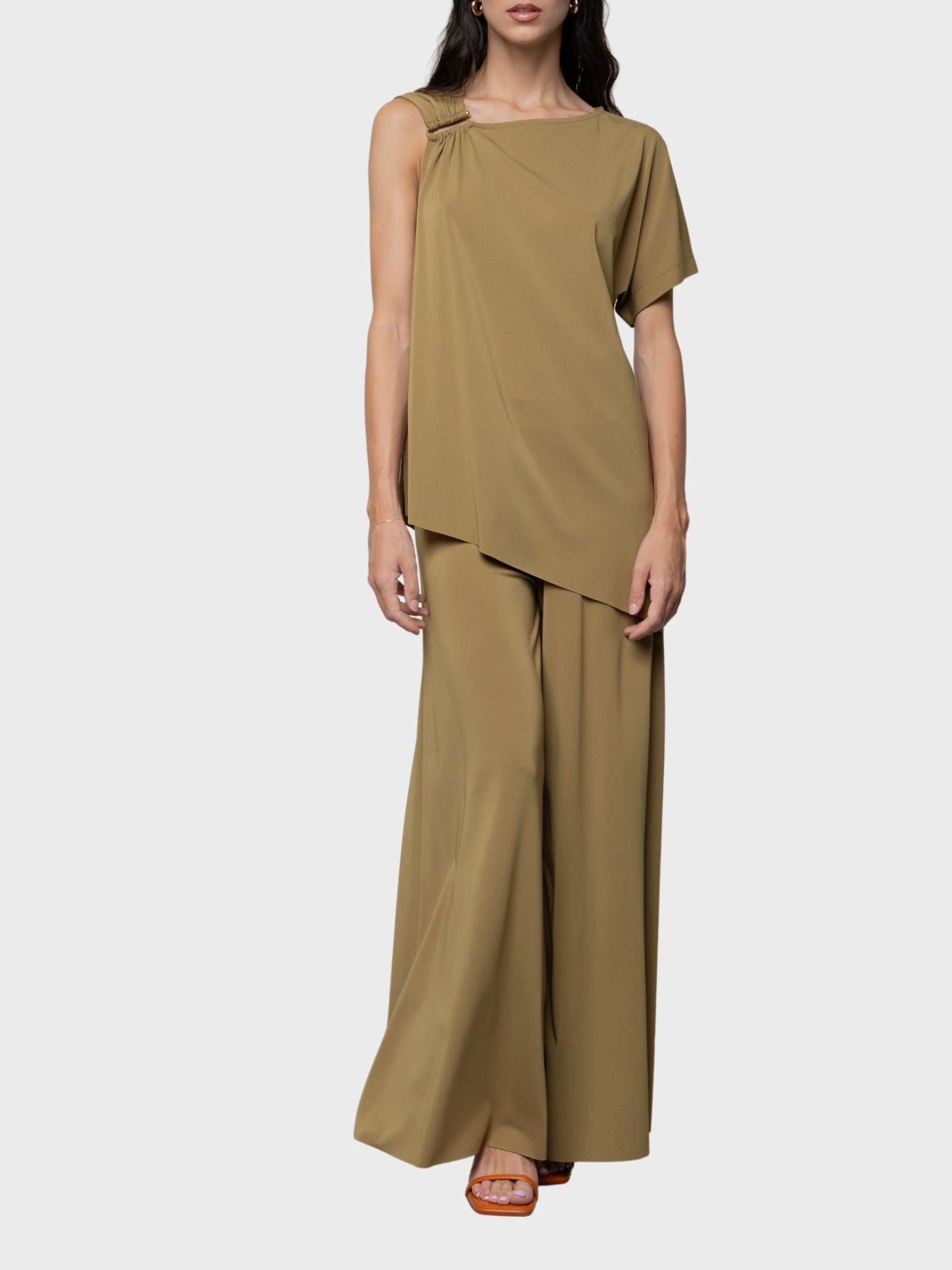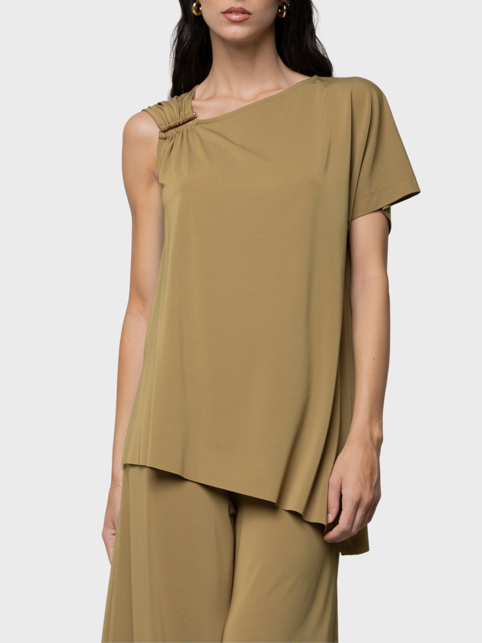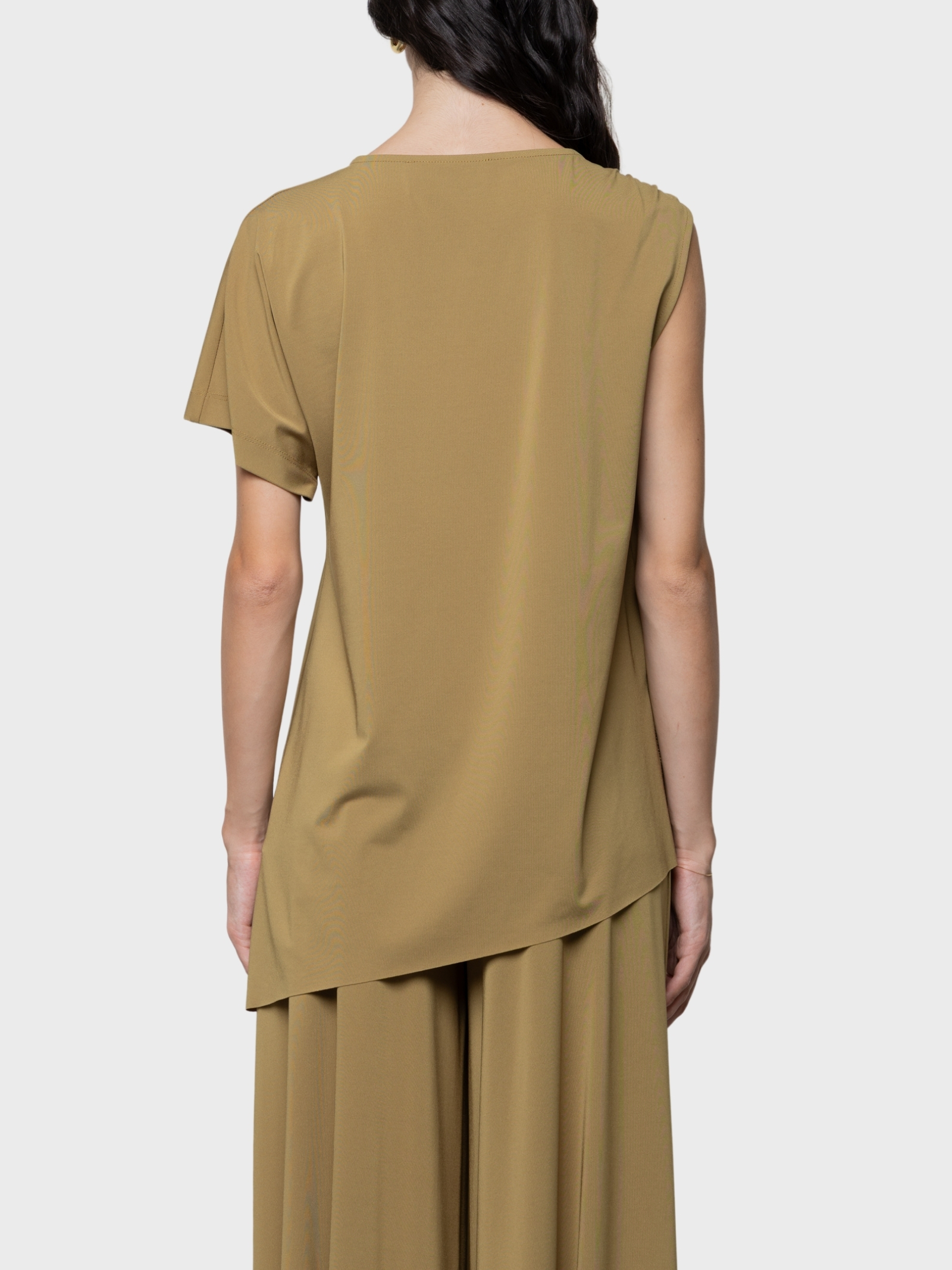 Top asimmetrico in crepe de chine misto seta con dettaglio plexiglass