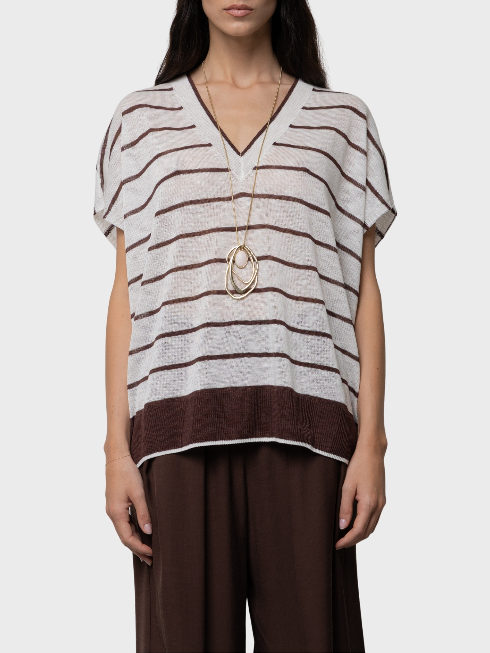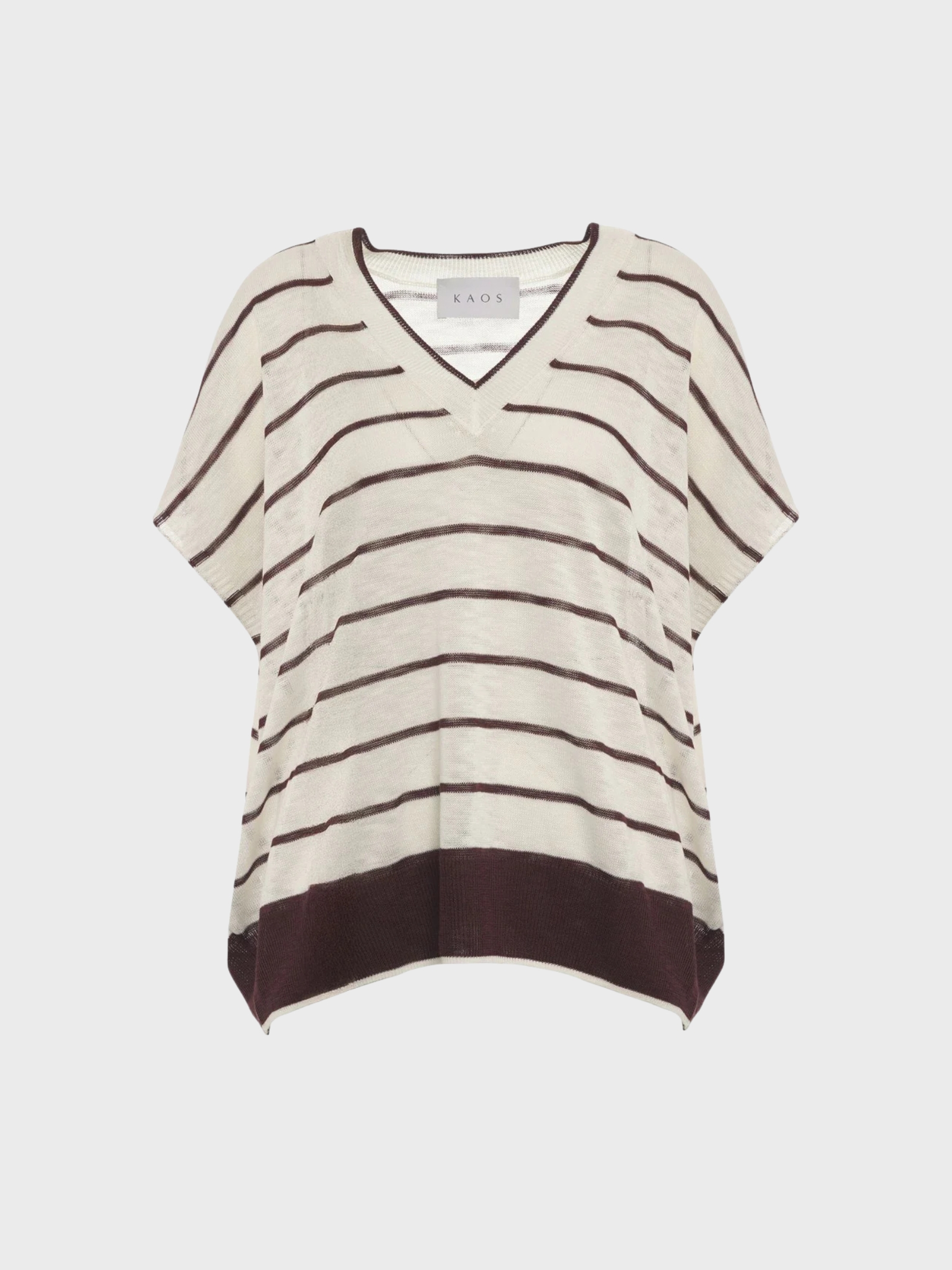 Maglione in maglia dal motivo a righe grafiche e silhouette rilassata. Il profondo scollo a V e le maniche corte creano un gioco di proporzioni moderno. Un capo versatile e raffinato, caratterizzato da lavorazione in maglia di qualità.