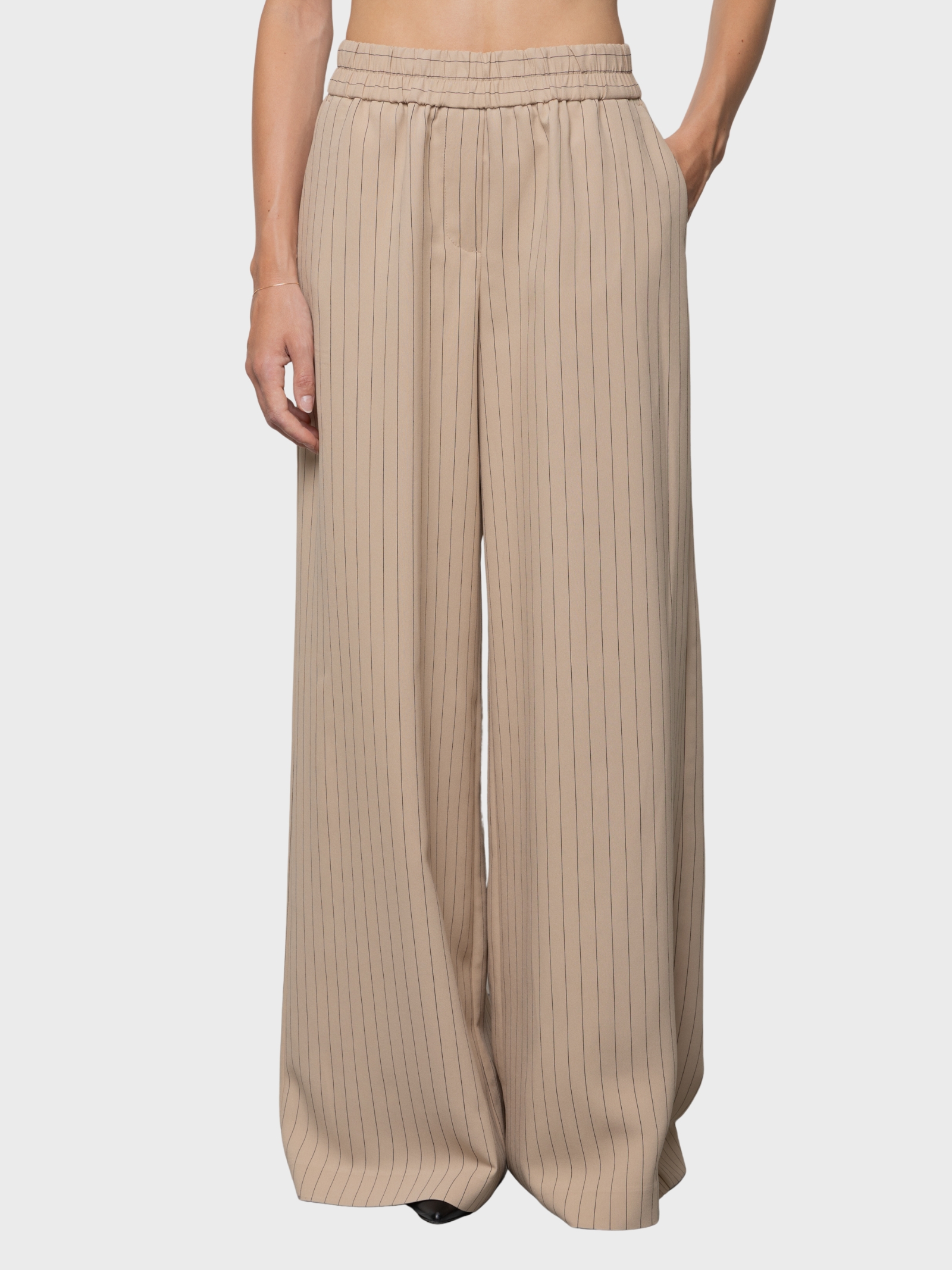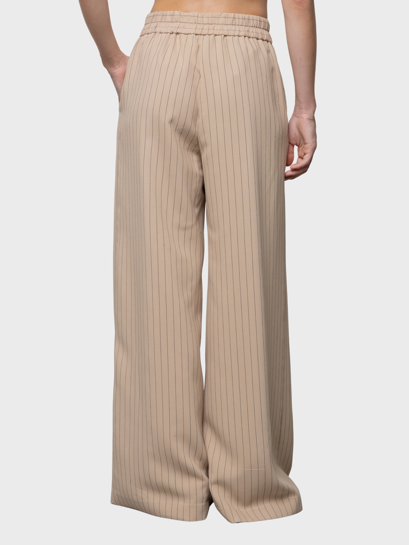 Pantaloni palazzo eleganti dal taglio fluido e motivo gessato intramontabile. La linea wide leg valorizza la silhouette con moderna eleganza, mentre la vita elastica assicura comfort e vestibilità impeccabile. Made in Italy, ideali per look sofisticati e contemporanei.