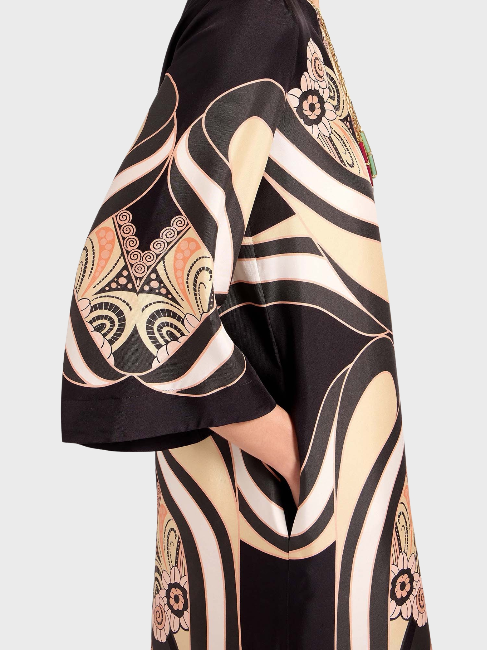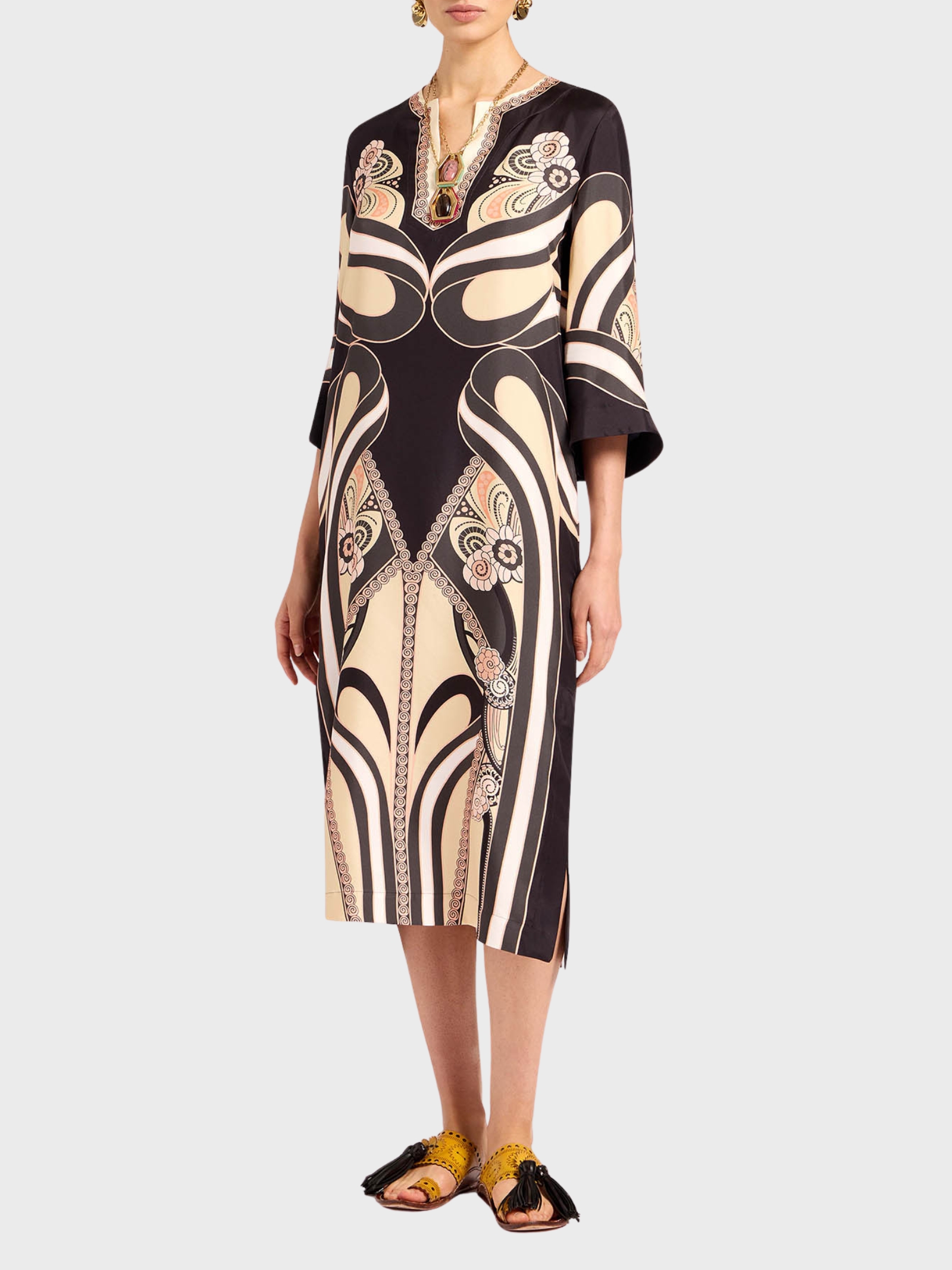 Caftano in twill di seta italiana, caratterizzato dalla raffinata stampa Ambrosia realizzata con lavorazione artigianale. La linea leggermente squadrata, più fluida rispetto alla versione in cotone, offre una vestibilità equilibrata tra struttura e movimento. Un capo sofisticato, perfetto per occasioni estive eleganti, dalle vacanze esclusive ai matrimoni sulla spiaggia, ideale anche per la sera abbinato a sandali o tacchi.