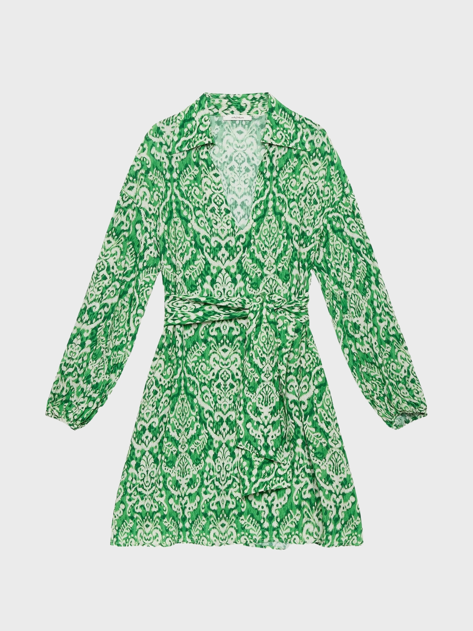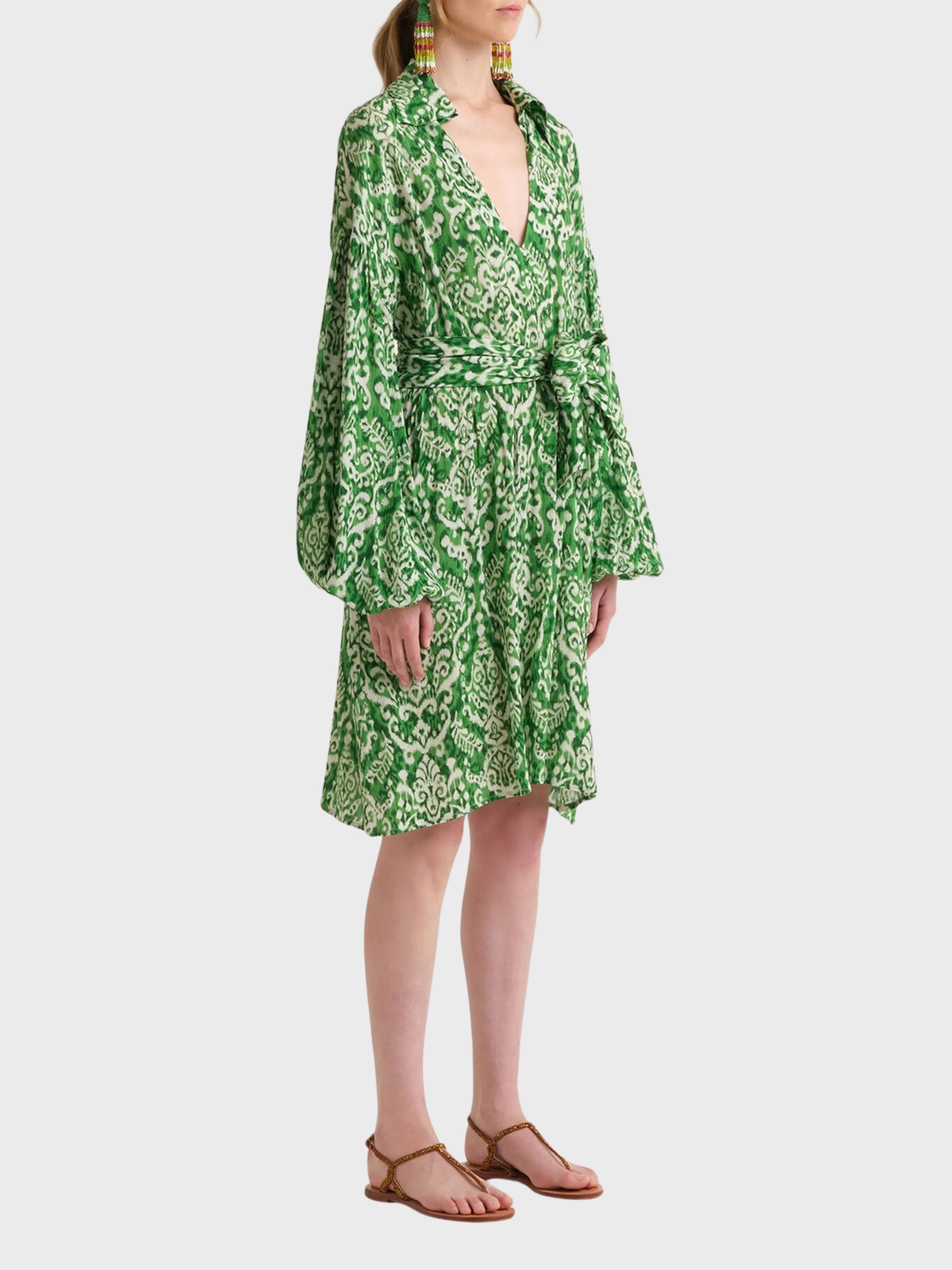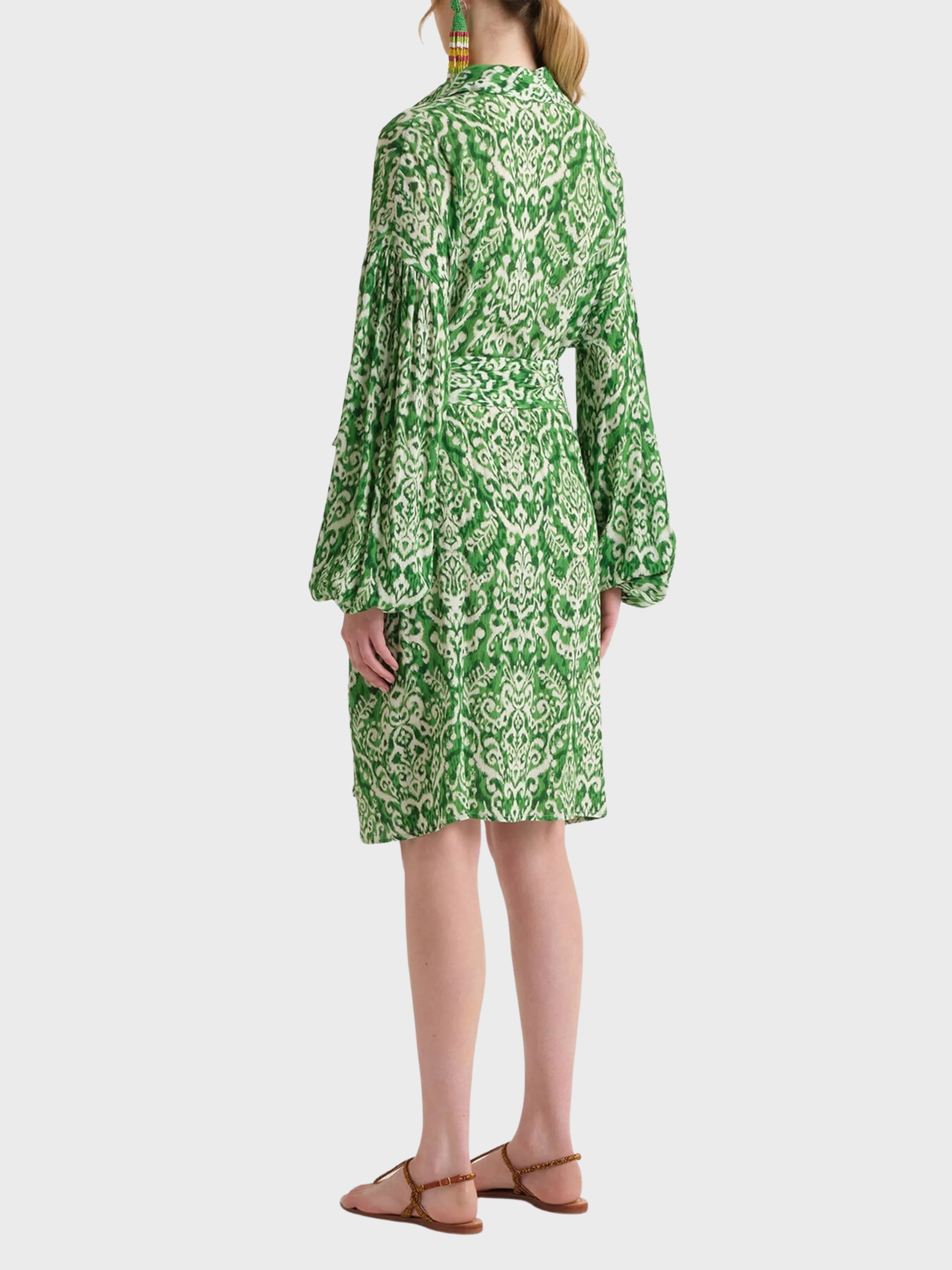 Abito al ginocchio in viscosa fluida stampata Ikat, caratterizzato da una texture goffrata verticale che dona movimento e un effetto naturalmente materico. Il collo a camicia con apertura stile kaftano conferisce al capo unallure rilassata e contemporanea, mentre la fusciacca in vita permette di definire la silhouette. Le maniche ampie con elastico al fondo creano un effetto balloon regolabile, aggiungendo volume e femminilità. Un abito versatile, ideale per il giorno e i momenti di viaggio.