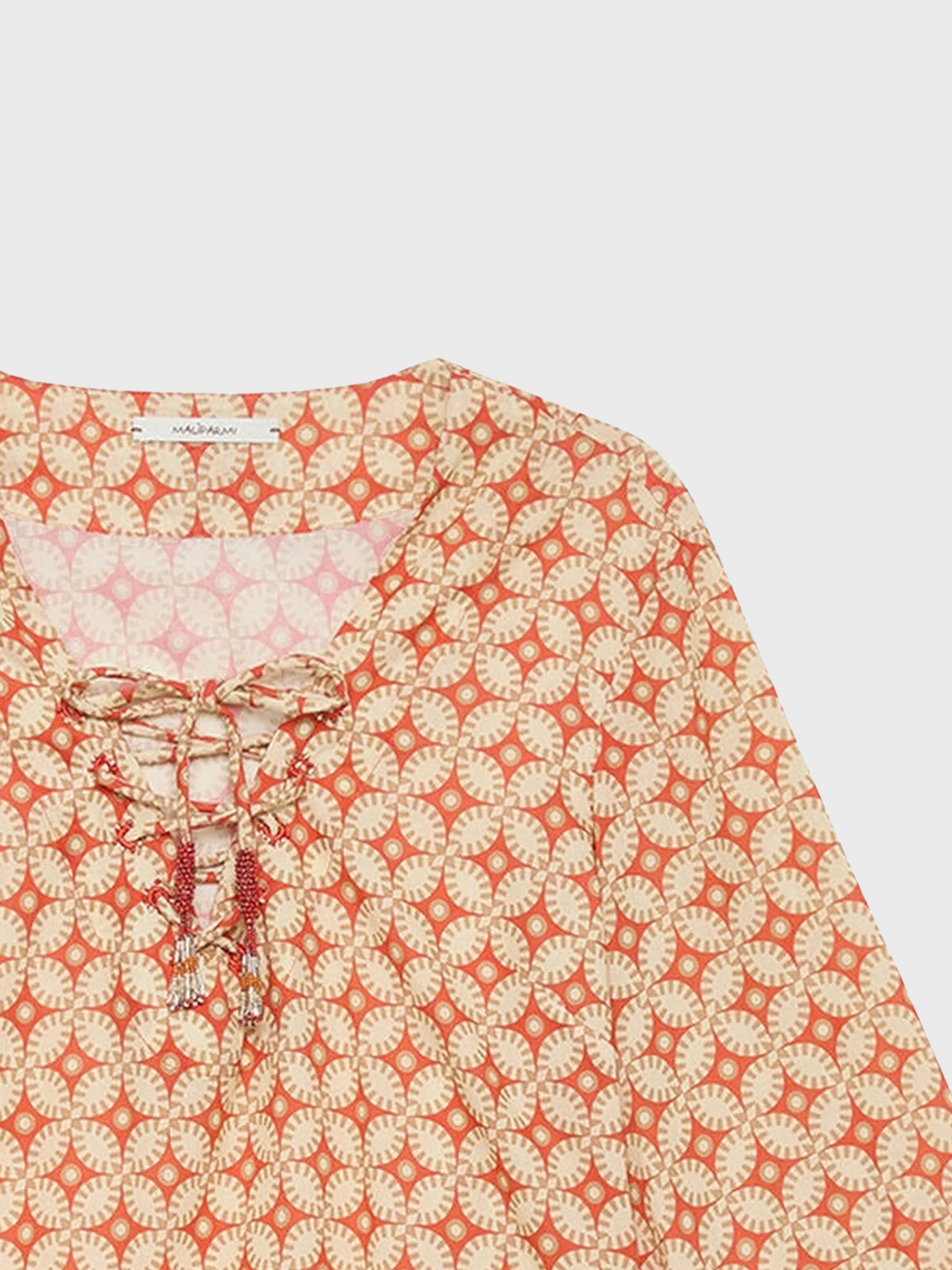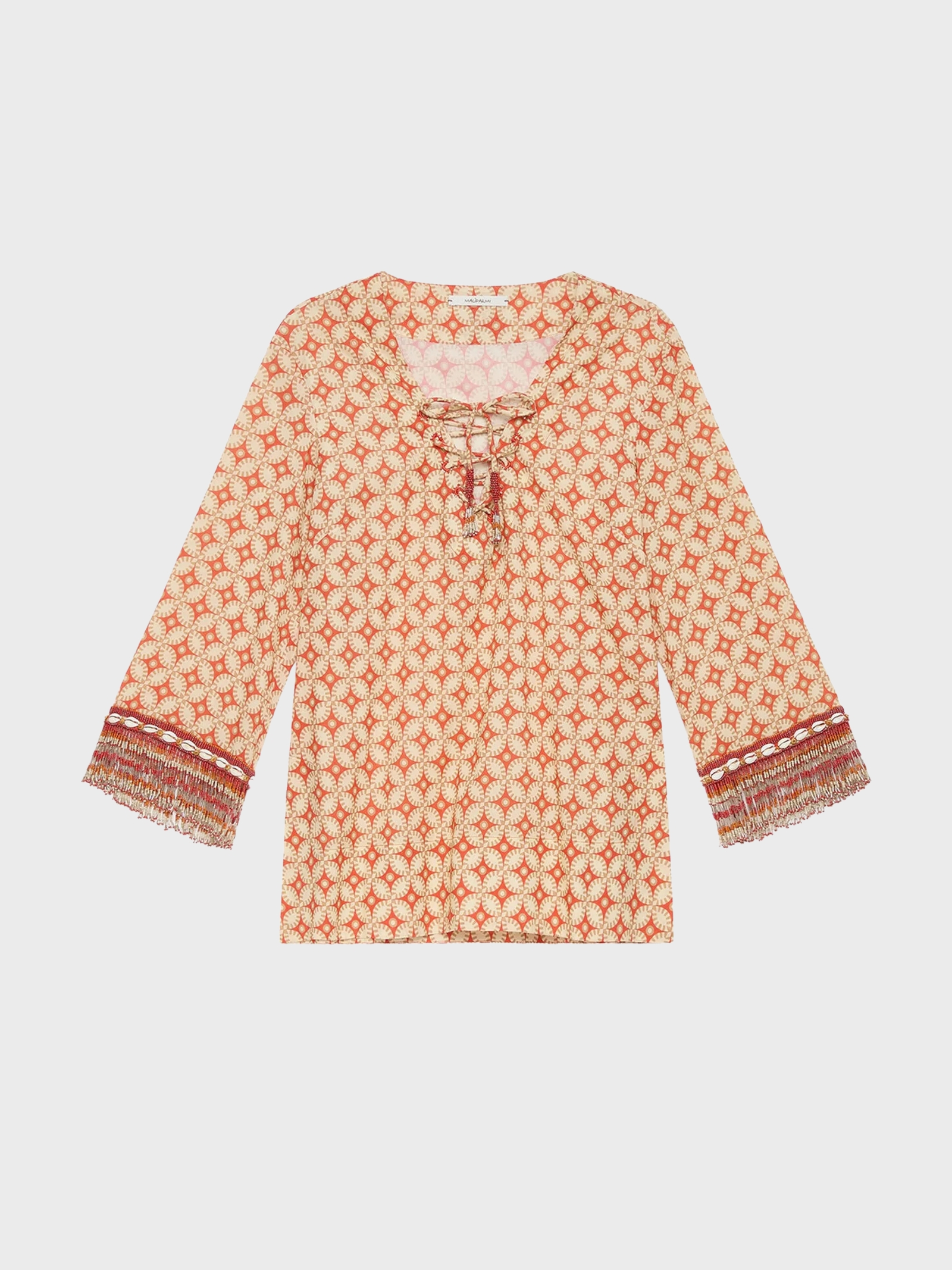 Casacca in leggera tela di cotone lavata dal carattere artigianale e raffinato. Lo scollo a V con allacciatura incrociata è regolato da una coulisse che termina con nappine ricamate a mano con perline. Le maniche a tre quarti sono arricchite da fasce decorative con perline e conchiglie, che si completano in frange di perline per un effetto ricco e dinamico. La stampa geometrica di ispirazione balinese dona al capo unallure esotica e contemporanea. Un capo fresco e distintivo, perfetto per look estivi ricercati.