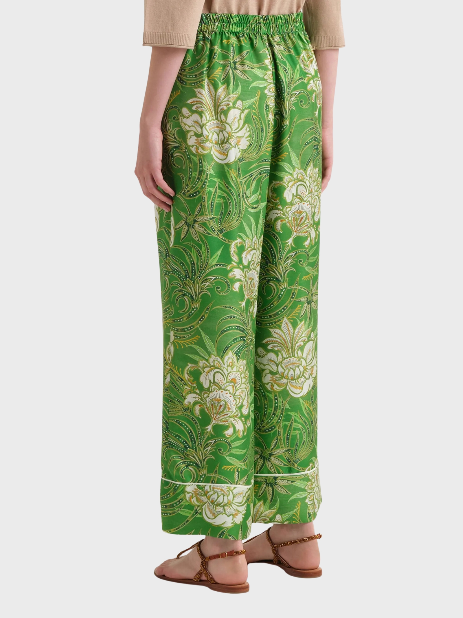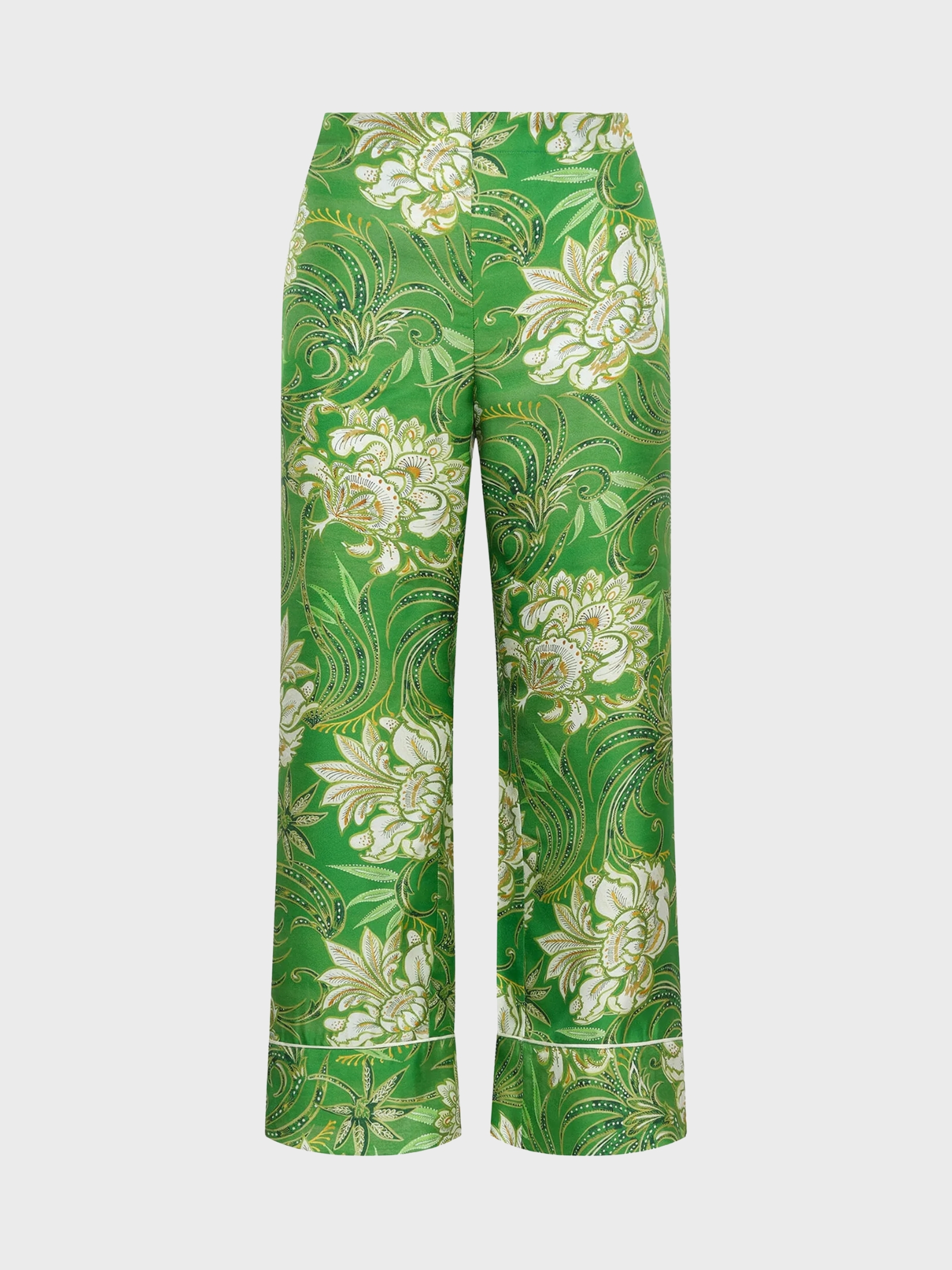 Pantalone dalla linea dritta e fluida in morbido twill di seta stampato, dal design elegante e contemporaneo. La costruzione con vita piatta sul davanti ed elastico sul retro garantisce comfort e una vestibilità femminile e naturale. Il dettaglio del piping inserito nella cucitura aggiunge un tocco sartoriale e raffinato, mentre la stampa vivace dona carattere e luminosità al capo. Perfetto per look versatili, dal giorno alla sera.