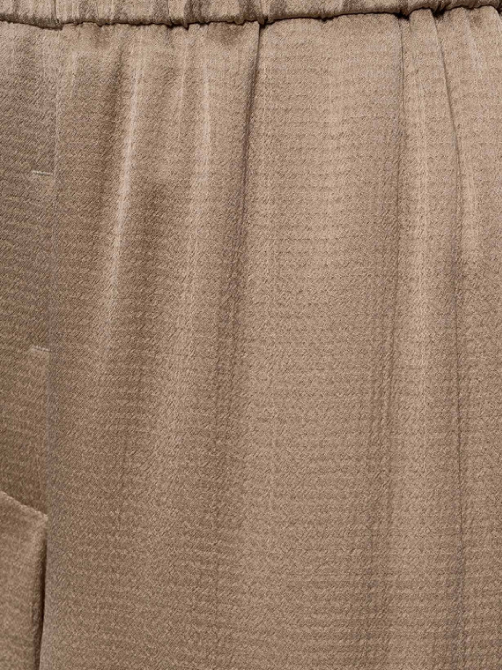 Pantalone palazzo realizzato in raso fluido martellato in misto viscosa, caratterizzato da una superficie leggermente irregolare che cattura la luce e dona profondità al colore. La caduta morbida del tessuto valorizza il movimento della linea, rendendolo ideale sia come protagonista del look sia in abbinamento a top e blazer coordinati per un completo distintivo.