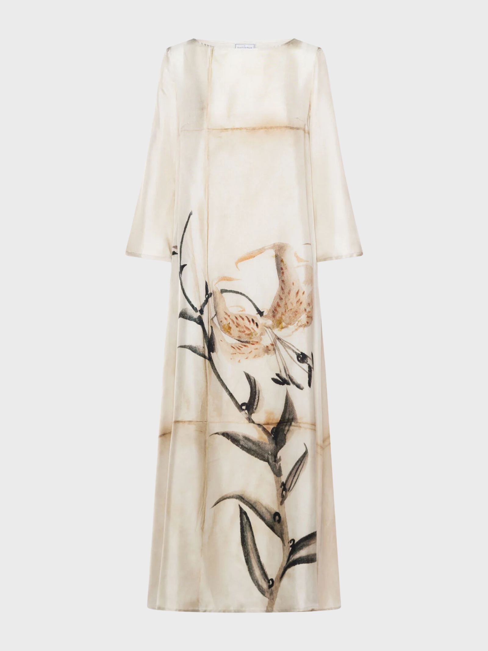 Etereo abito kaftan in seta dalla linea ad A, caratterizzato da un delicato motivo floreale in tonalità morbide e terrose. La silhouette fluida e morbida, con maniche lunghe e ariose, sprigiona uneleganza senza tempo. Perfetto da abbinare a gioielli minimalisti e sandali essenziali per un look sofisticato e naturale