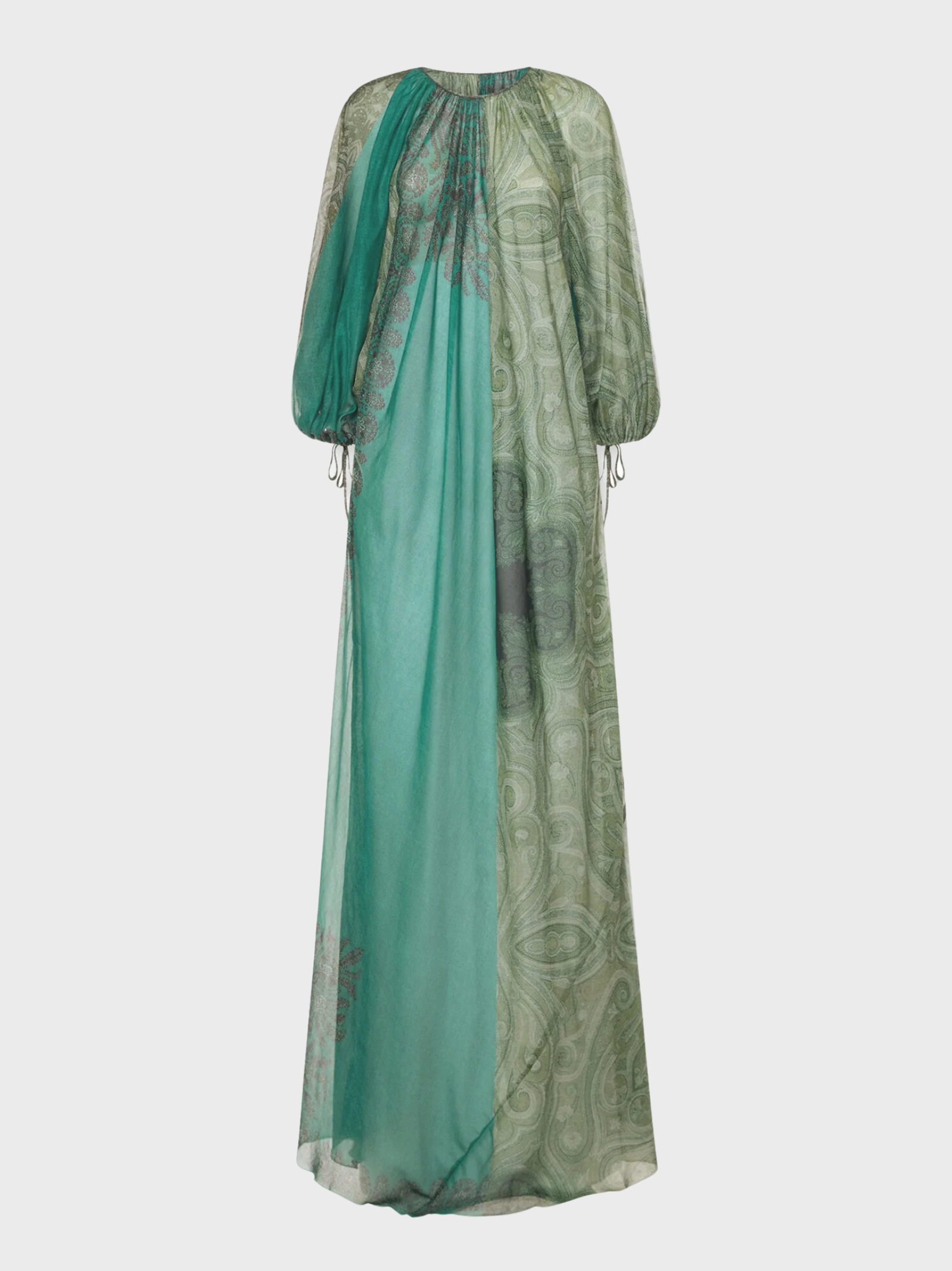 Abito lungo dallallure eterea, caratterizzato da una silhouette fluida con maniche a sbuffo voluminose e scollo arricciato. Il raffinato motivo paisley nelle intense tonalità smeraldo richiama uneleganza pacata e un fascino daltri tempi. Ideale per una festa in giardino al calar della sera, da abbinare a sandali delicati e gioielli discreti per esaltarne il carattere bohémien.