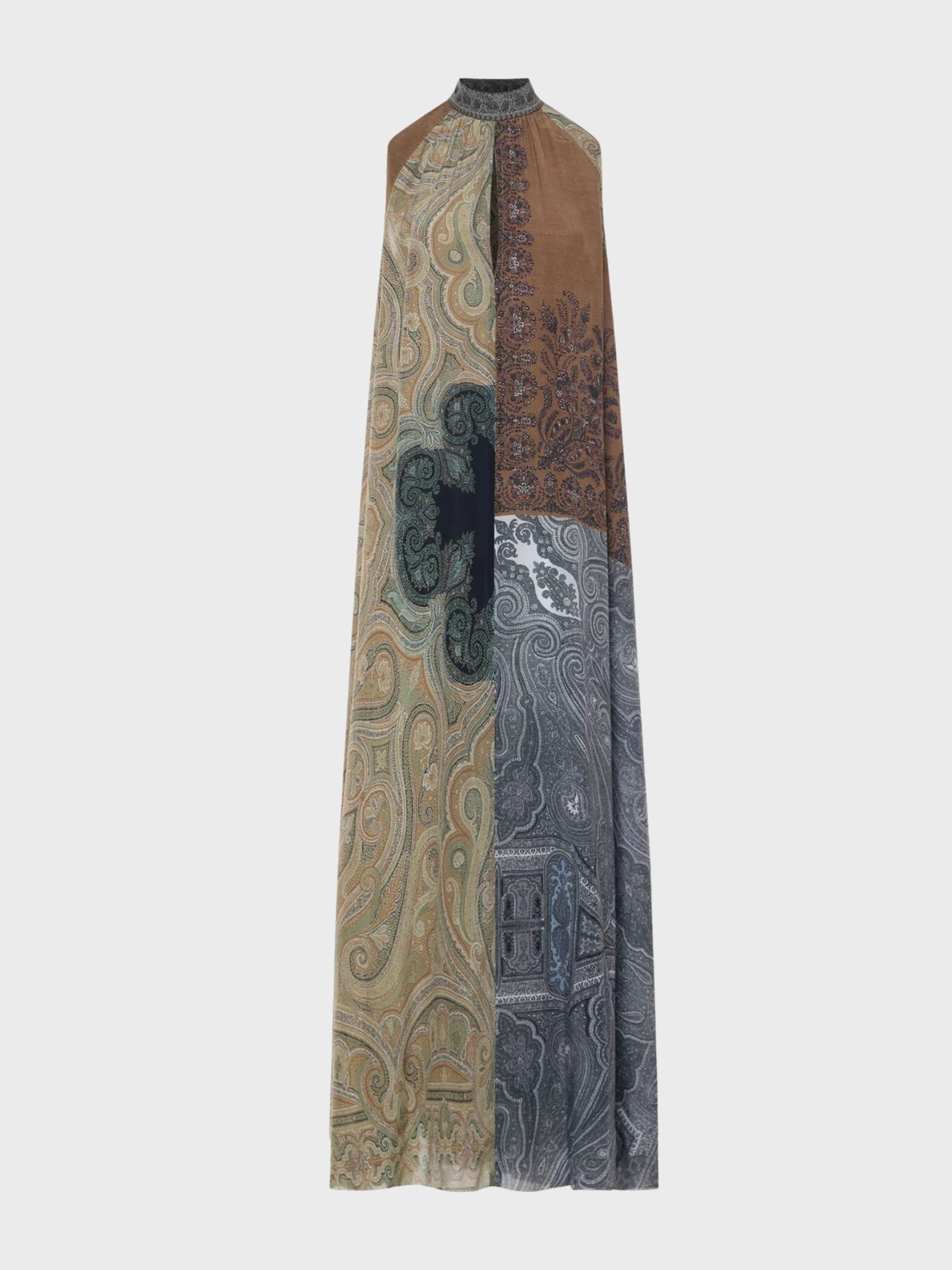 Abito lungo scivolato caratterizzato da un collo allamericana e un armonioso patchwork di motivi paisley e floreali nei toni della terra. La morbida caduta del tessuto prezioso evoca uneleganza artistica, ideale per una serata raffinata. Perfetto da abbinare a sandali discreti e a una pochette delicata per un look naturalmente sofisticato.