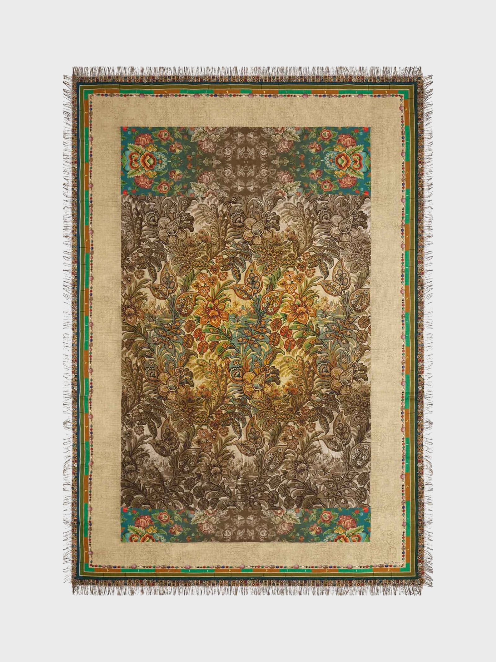Scialle in seta 135x195 cm, capolavoro di intricati motivi floreali e paisley nelle tonalità della terra, incorniciato da vivaci bordi a contrasto. Larmonia dei colori evoca uneleganza vintage e raffinata. Perfetto da appoggiare sulle spalle come pezzo deffetto o da indossare come avvolgente complemento opulento per i look da sera.