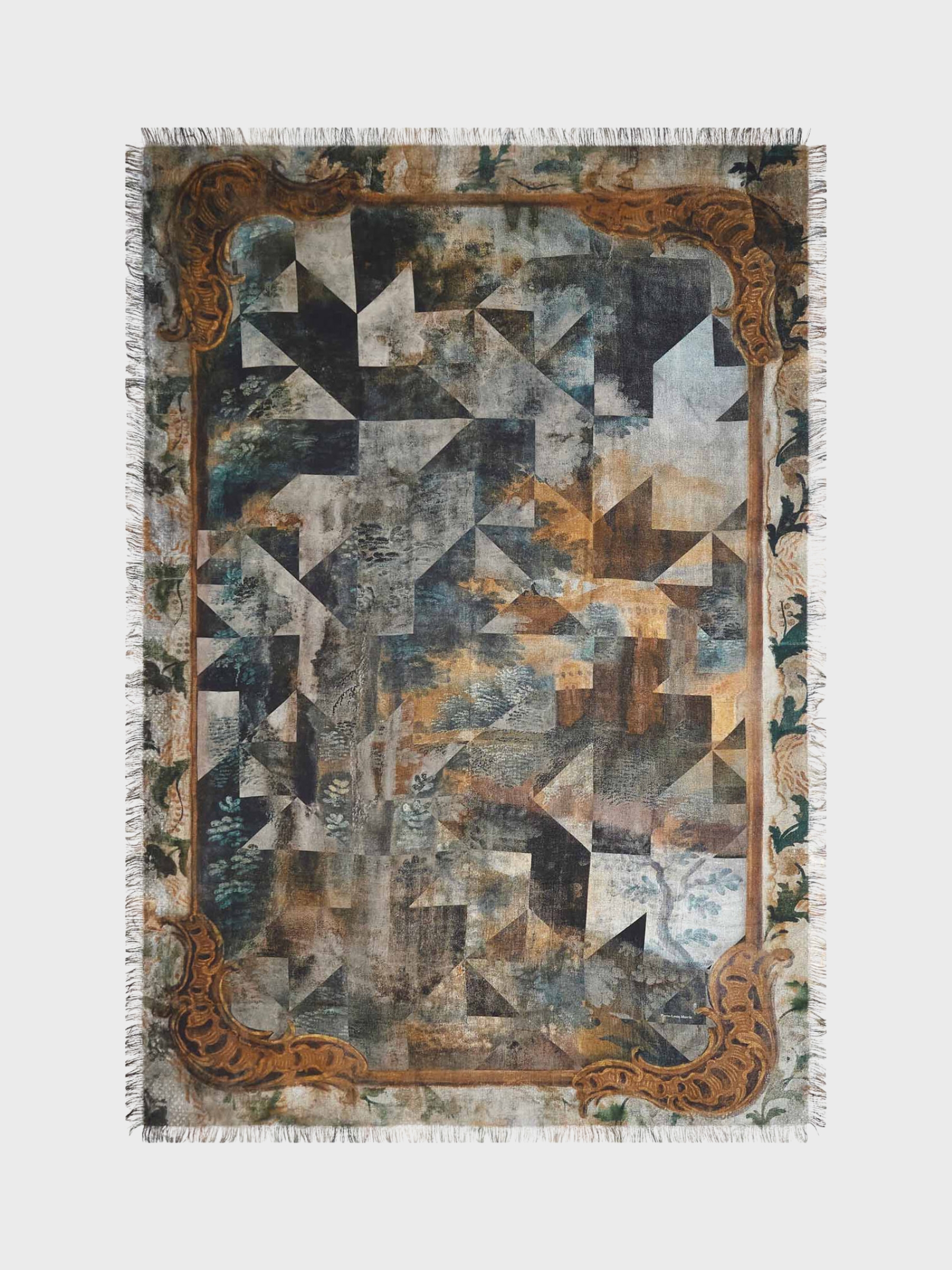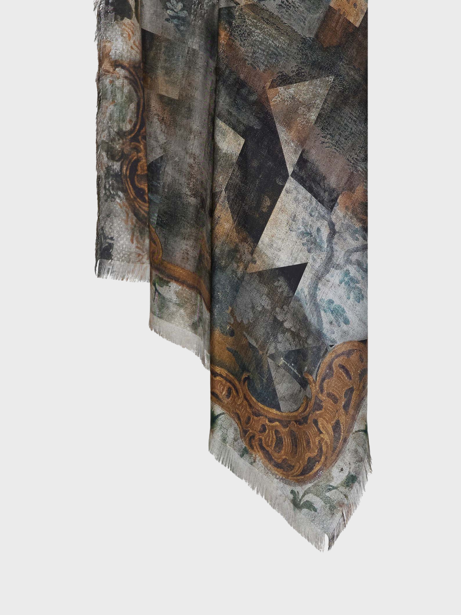 Scialle in seta stampata 135x195 cm che sprigiona un raffinato connubio di astrazione geometrica e ornamentazione barocca. La palette attenuata di tonalità terrose evoca un senso di eleganza senza tempo. Le frange sui bordi aggiungono un tocco di sofisticazione. Perfetto da indossare su un cappotto sartoriale per un look chic e senza sforzo, che unisce fascino vintage e raffinata modernità.