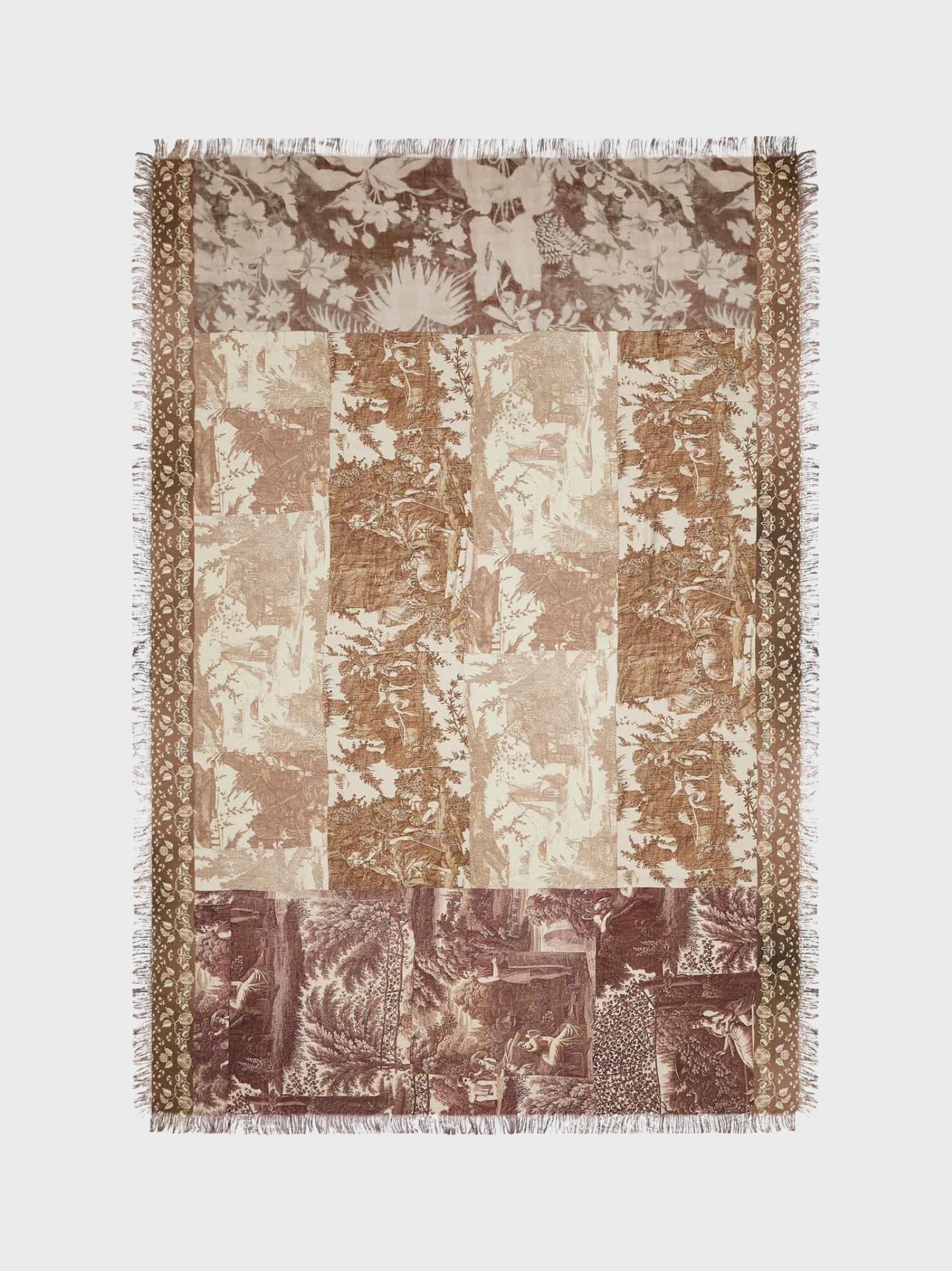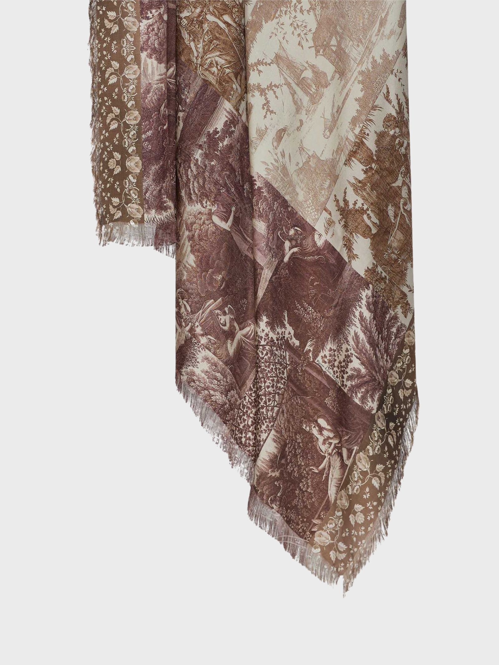 Stola in seta stampata 135x195 cm che rivela un affresco di scene bucoliche nei toni del seppia, evocando un senso di eleganza senza tempo. La narrazione minuziosa e i delicati profili sfrangiati aggiungono un fascino poetico. Perfetta da appoggiare su un cappotto sartoriale oppure da stringere in vita per un gesto di stile sofisticato e artistico.
