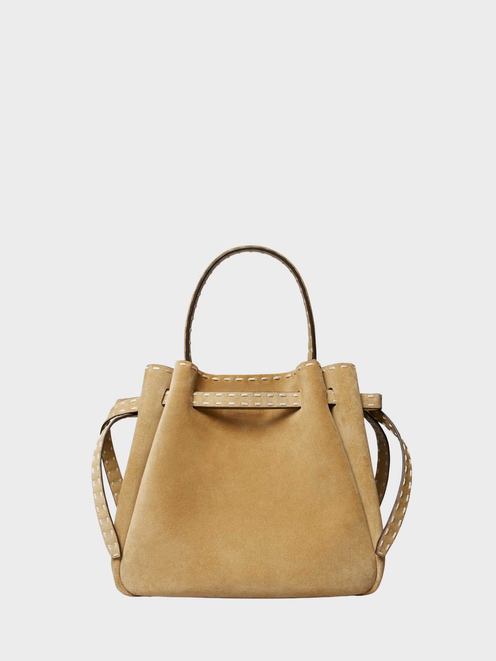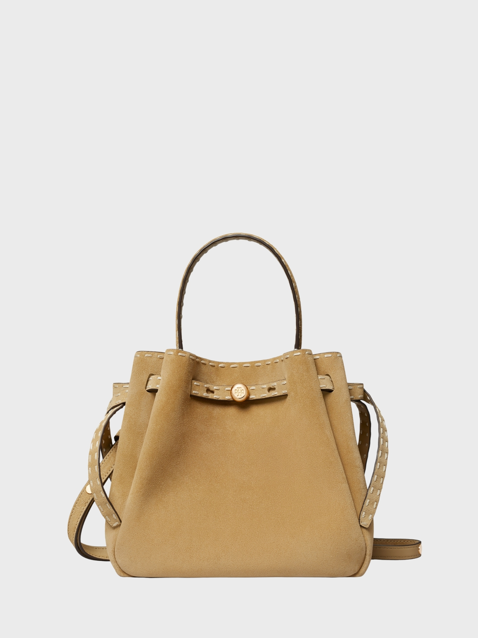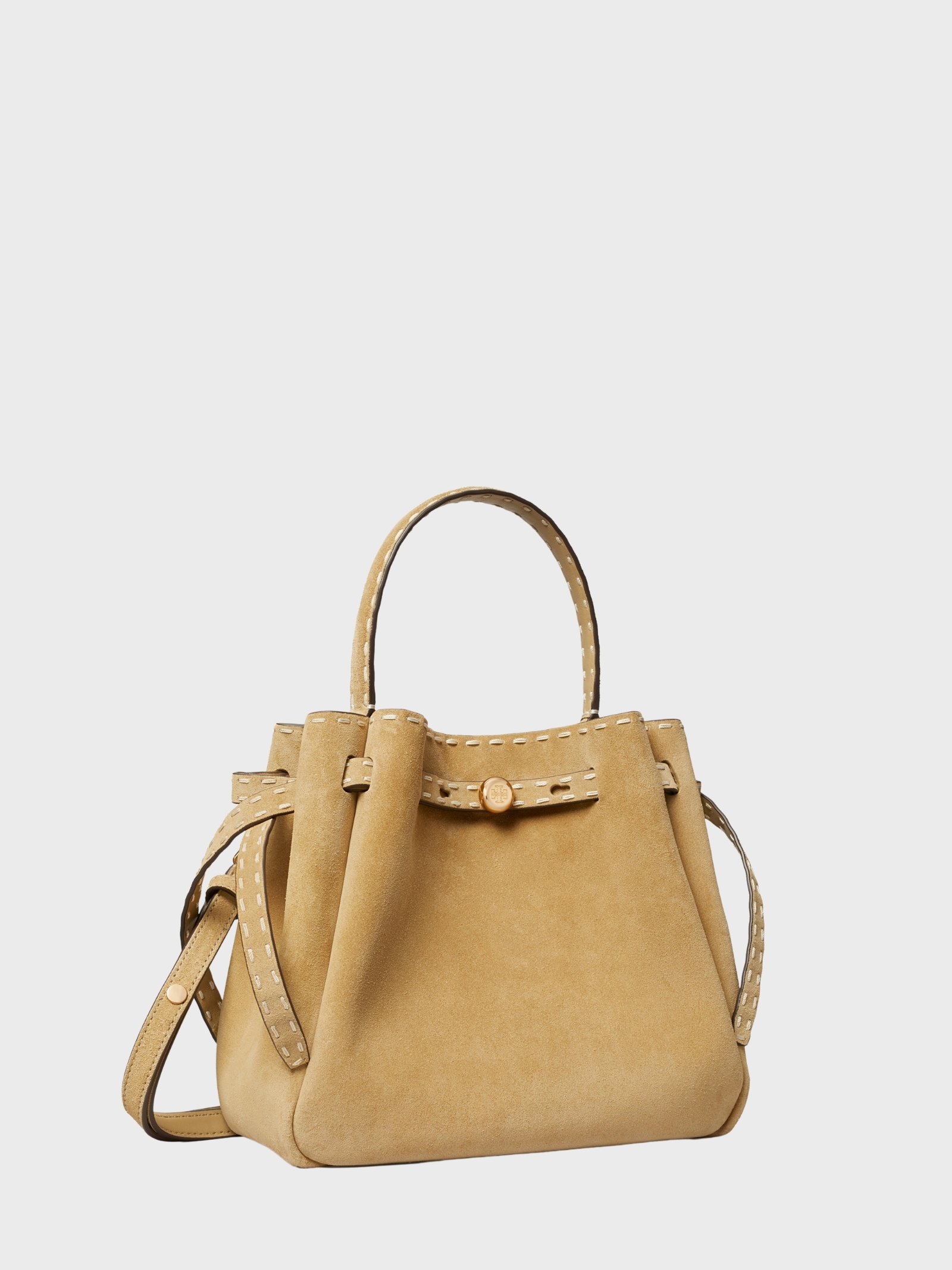 La borsa a secchiello Romy è ideale per tutti i giorni, realizzata in suede italiano spazzolato con dettagli cuciti a mano e silhouette leggermente arricciata; leggera e spaziosa, può contenere telefono, portafoglio, tablet e chiavi, ed è completata da cinturino sottile e logo a bottone. Si porta a mano o a tracolla grazie al manico superiore e tracolla regolabile.